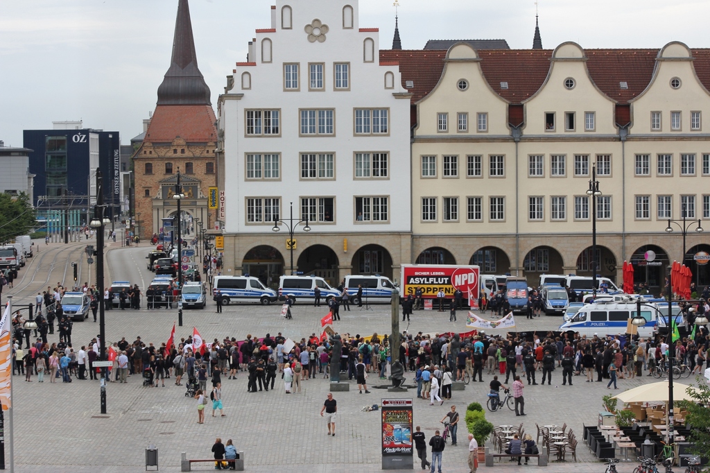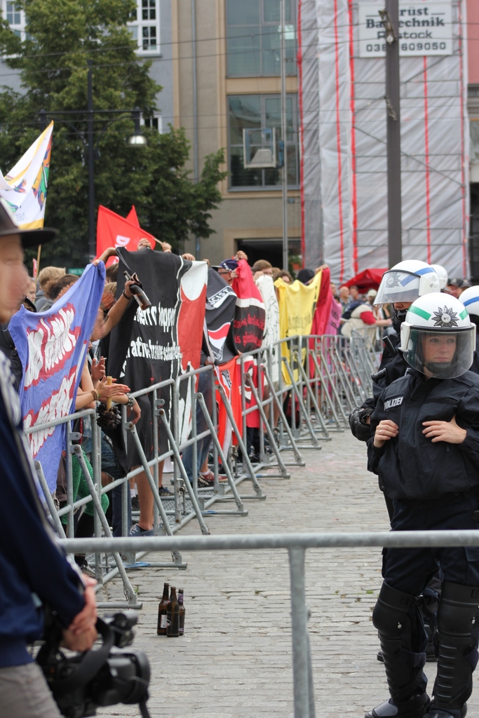 Schon im Vorfeld hatte die Stadt Rostock verfügt, dass die Markttreibenden mit ihren Ständen vom Neuen Markt auf den Uniplatz umziehen mussten. So wurde Platz geschaffen für ein weites Gehege, in dem die NPD ihre Kundgebung abhalten konnte.