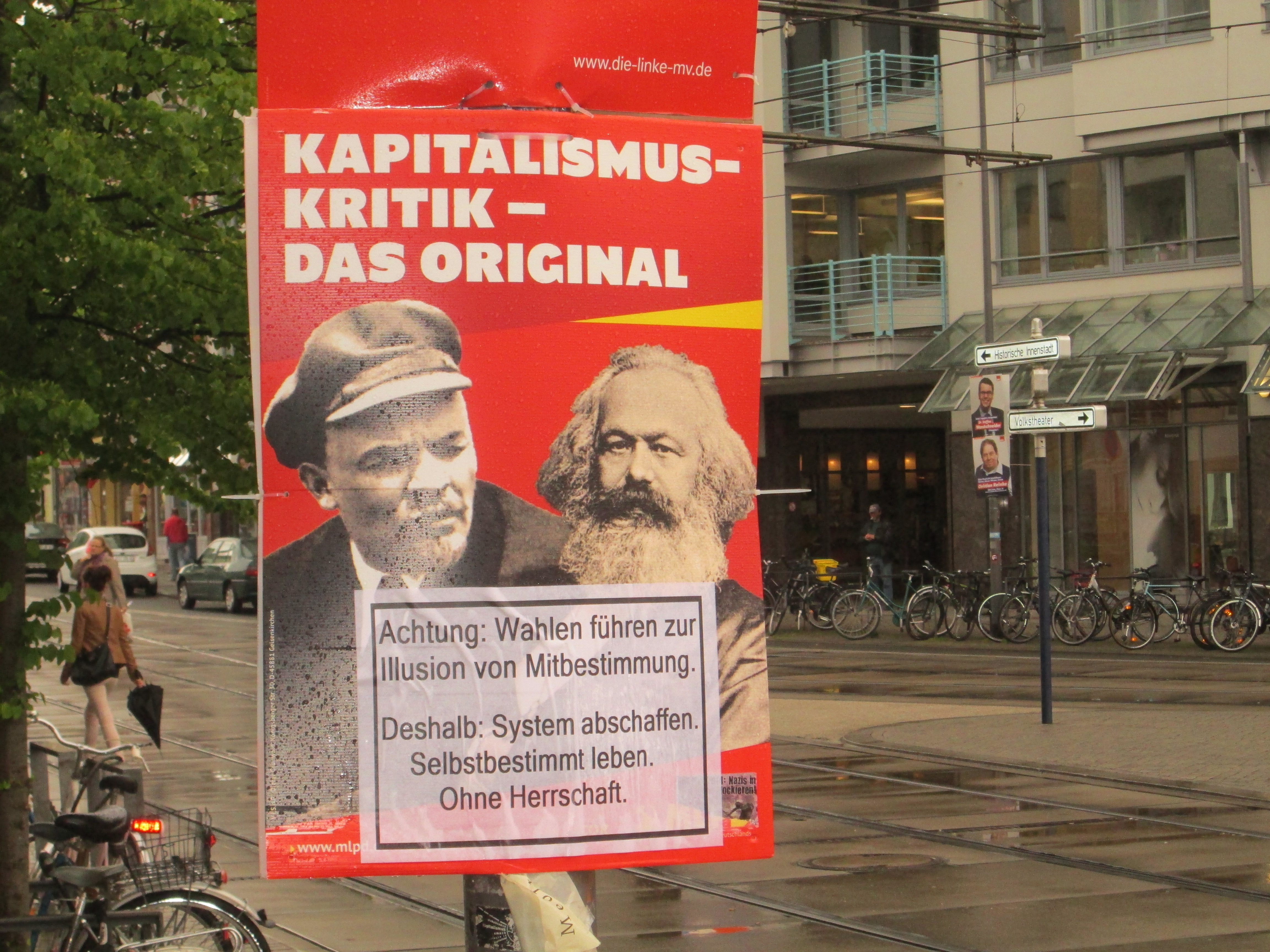 Eine gerechtere Welt wird es nur geben, wenn endlich auf Herrschaft und Ausbeutung konsequent verzichtet wird. Eine gerechtere Welt wird es nur geben, wenn freie Menschen in freiwilligen, selbstbestimmten Vereinbarungen zusammen leben. Eine bessere Welt wird es nur geben, wenn sich endlich alle Menschen einen gleichberechtigten Zugang zu den gesellschaftlichen Ressourcen erkämpfen. Einen Anfang haben wir heute Nacht vielleicht mit der temporären Rückeroberung des öffentlichen Raumes „Wahlplakat“ rund ums Rostocker Rathaus gemacht.