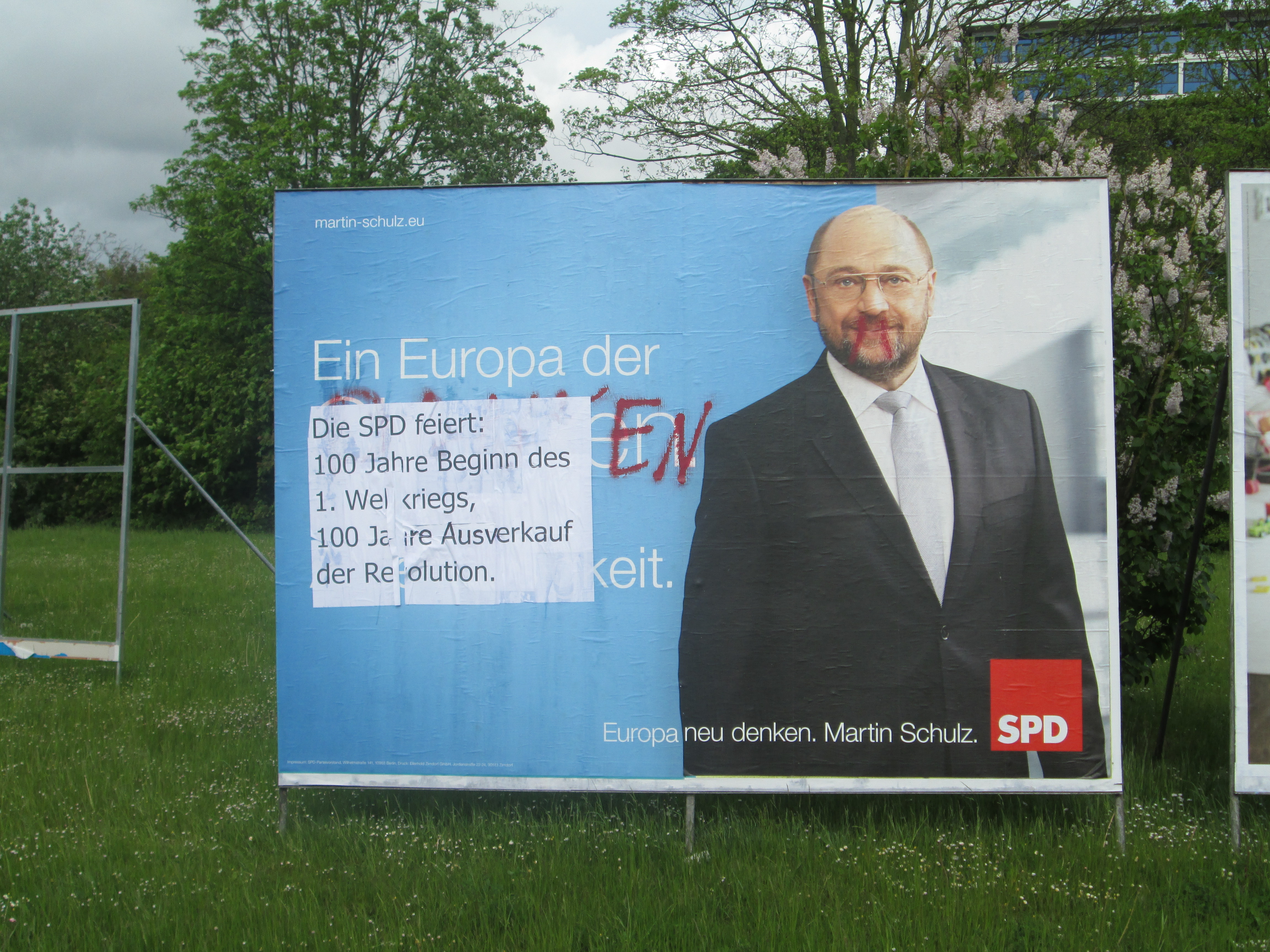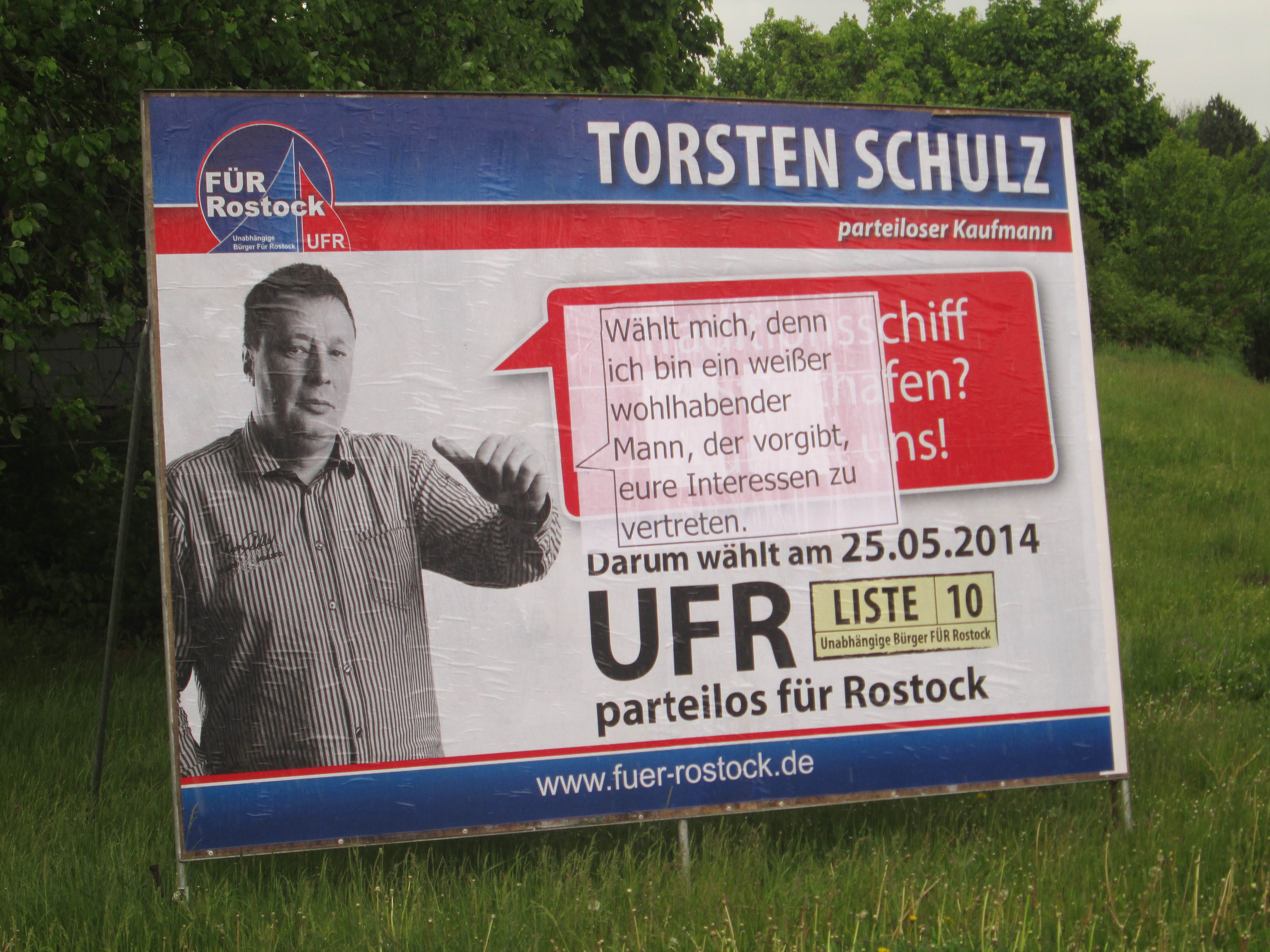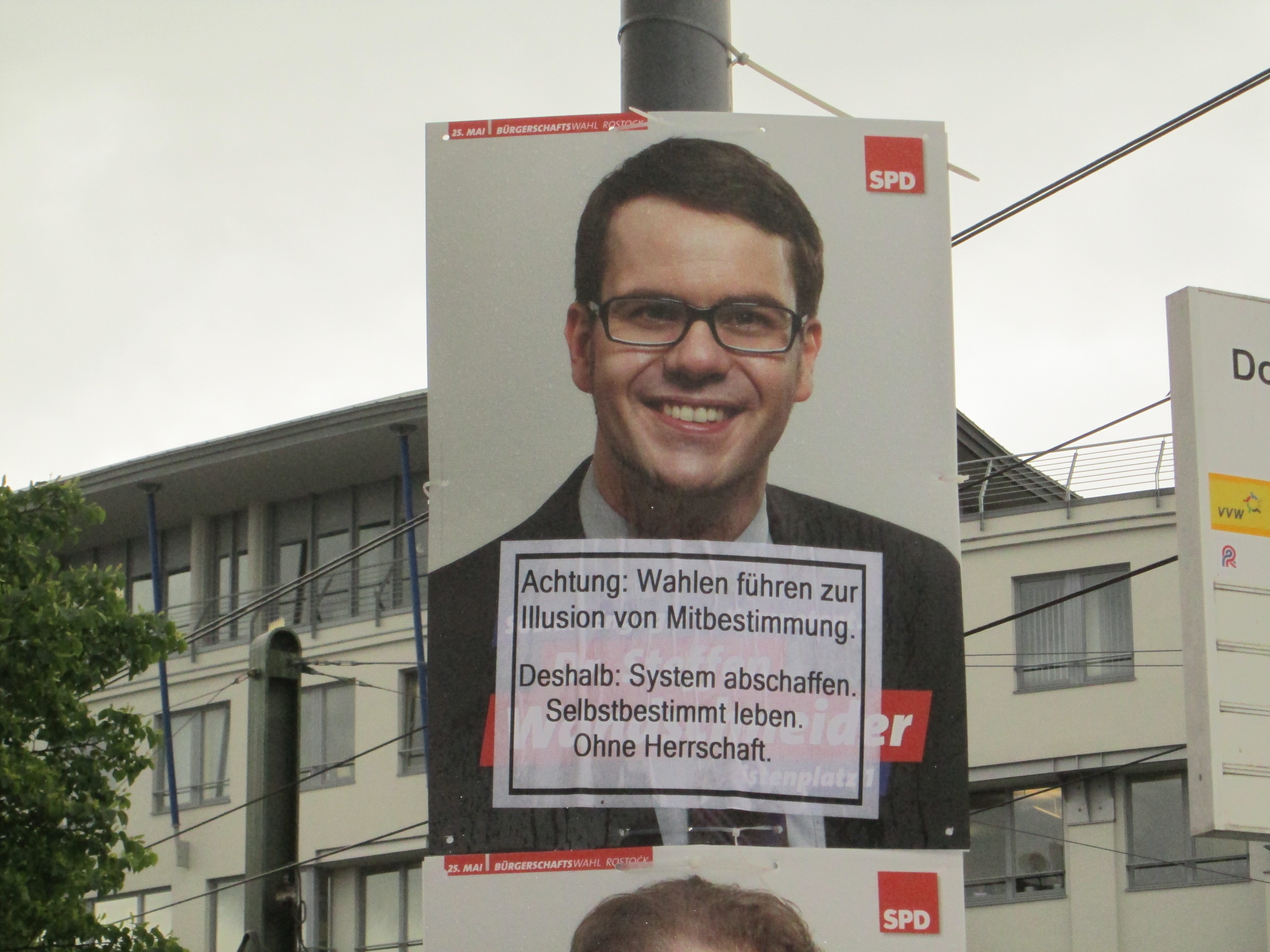 In der Nacht vom 11.5.2014 auf den 12.5.2014 hat sich eine bisher unbekannte KünstlerInnengruppe in das Finale des laufenden Europa-und Kommunal-Wahlkampf ungefragt eingemischt. Ihr Ziel waren dabei hauptsächlich die großen Wahlplakate im Rostocker Innenstadtbereich und rund ums Rathaus. Diese wurden mittels Farbe und Aufklebern zu politischen Kunstwerken umgestaltet. Laut ihrem Bekennerinnenschreiben hofft die Gruppe, den Angehörigen der Fraktionen, den MitarbeiterInnen der Stadtverwaltung und dem OB, die sich wie selbstverständlich jeden Tag einreden, alle anderen Menschen zu vertreten, ein paar neue Perspektiven auf ihre Politik aufzeigen zu können.