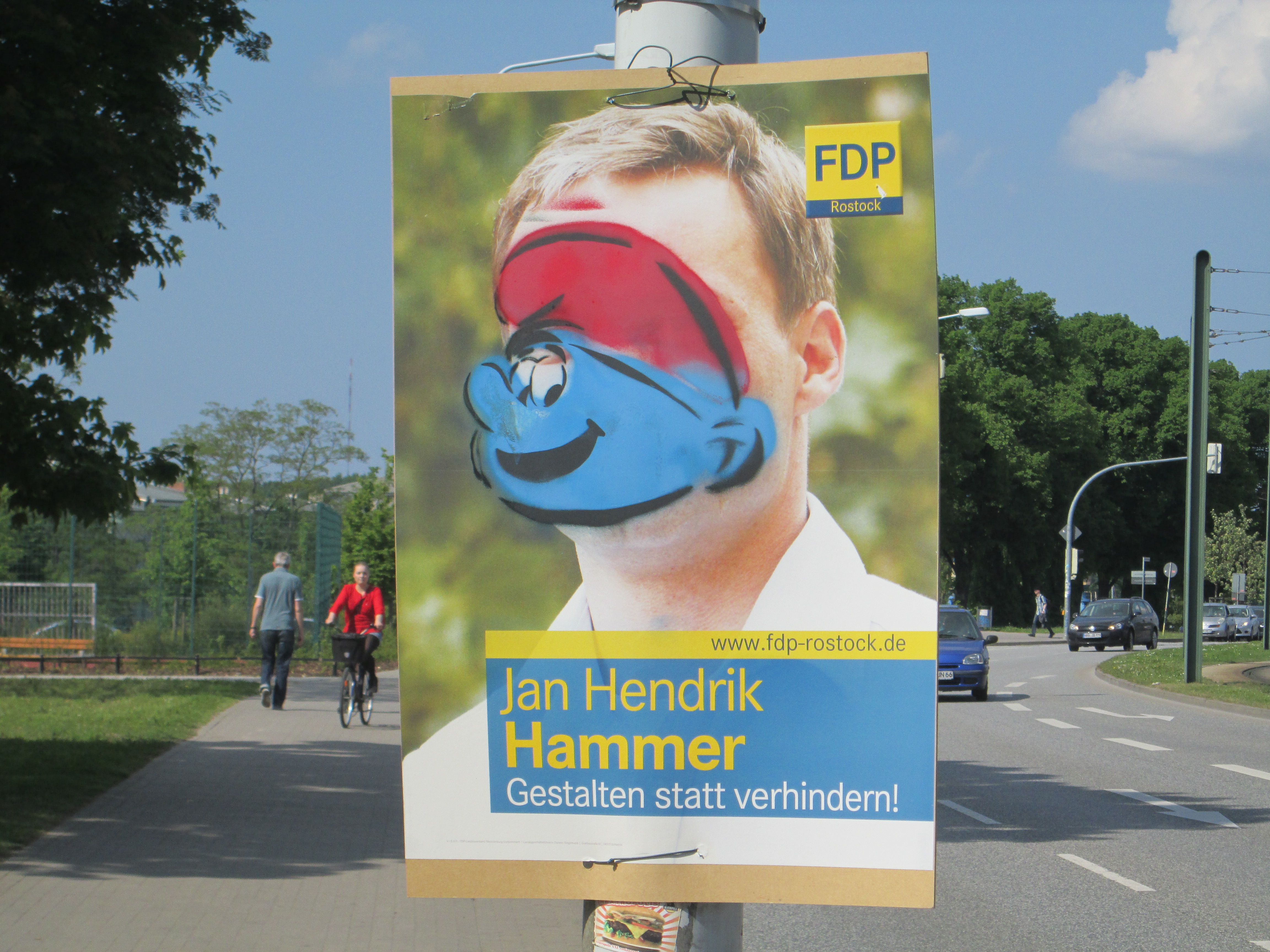 Nachdem die Ostseezeitung bereits in der letzten Woche über böswillige Verfremdungen an Wahlplakaten berichtete und das Thema mehrmals in Kommentaren und Glossen angeschnitten wurde, kam es in der Rostocker Innenstadt erneut zu Veränderungen von Wahlplakaten.