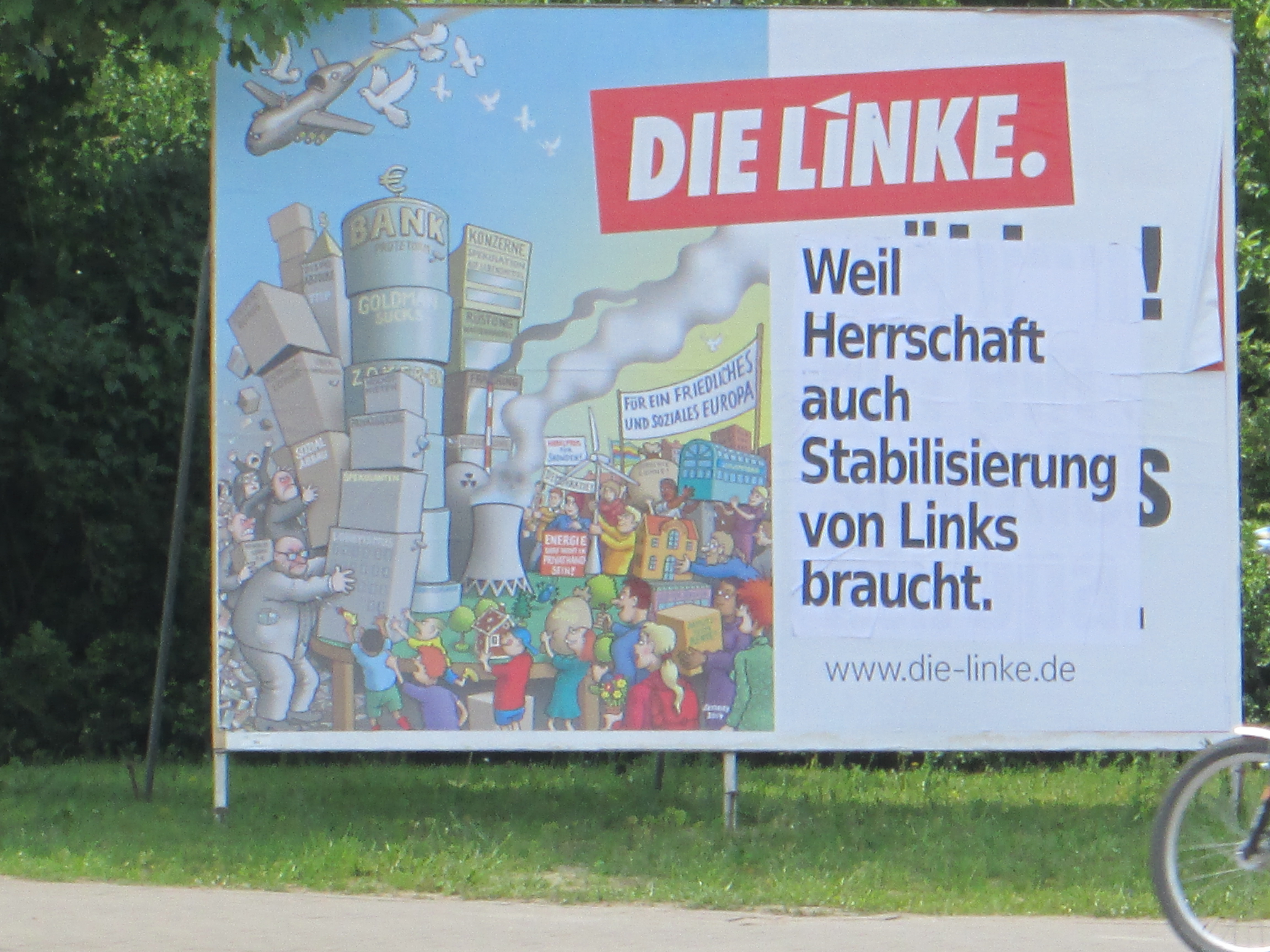 Doch auch die anderen Parteien blieben nicht verschont. So warb die Linkspartei mit dem Slogan: „Die Linke. Weil Herrschaft auch Stabilisierung von Links braucht.“ Damit soll offensichtlich auf die ambivalente Rolle der Linkspartei eingegangen werden .