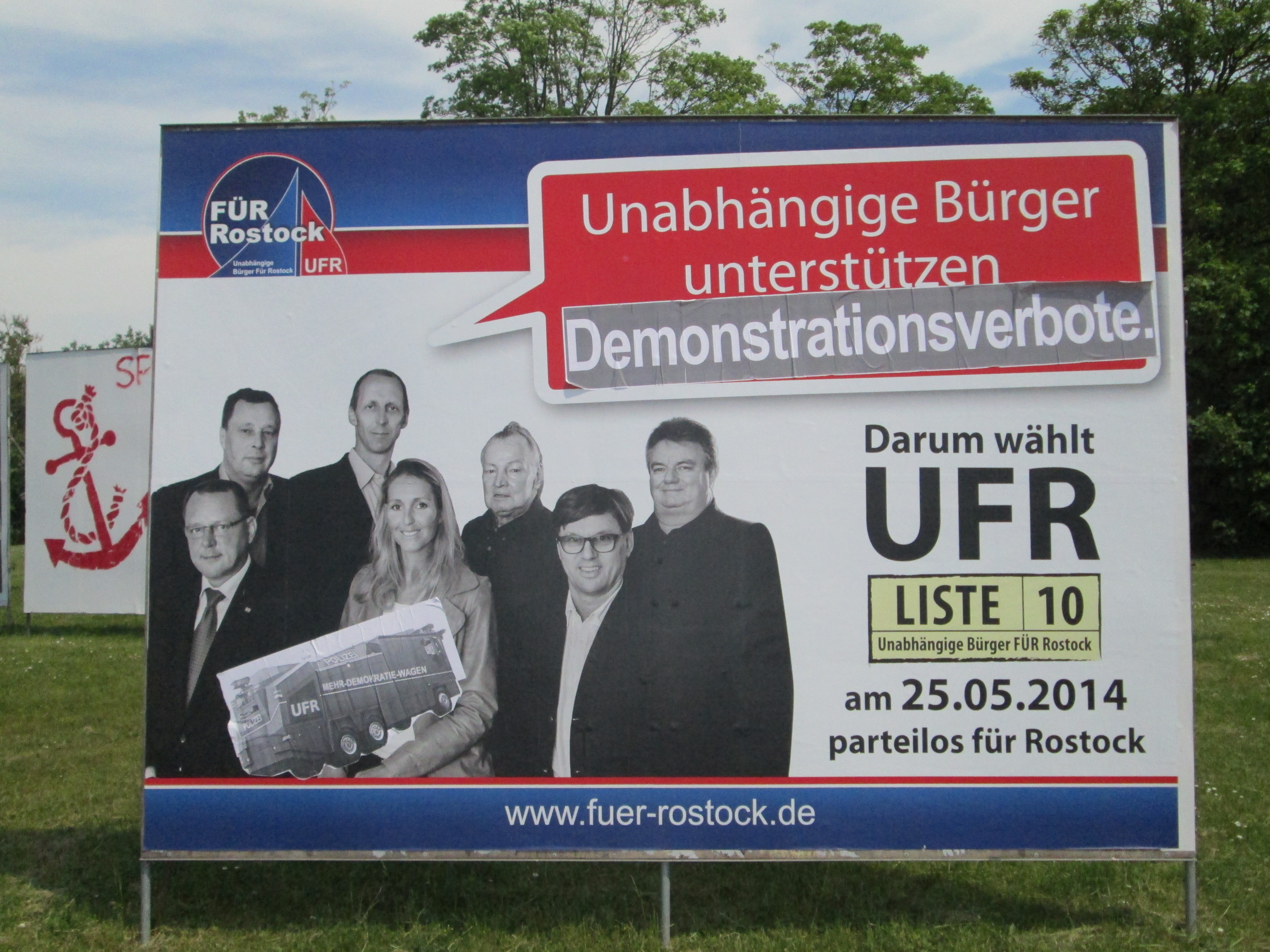 Die Betroffenen waren dabei wiederholt das Wahlbündnis „Unabhängige Bürger für Rostock“ (UFR), welches ähnlich wie die Partei „Einiges Russland“ im Falle Putins eigens zur Sicherung des Machterhaltes des Bürgermeister Roland Methling gegründet wurde. So legten die unbekannt gebliebenen KünstlerInnen dem UFR den Slogan „Unabhängige Bürger unterstützen Demonstrationsverbote“ in den Mund. Wahrscheinlich handelt es sich dabei um eine Anspielung auf die aktuellen Vorgänge um die Proteste anlässlich eines Naziaufmarsches am diesjährigen 1. Mai. Mehr Infos: