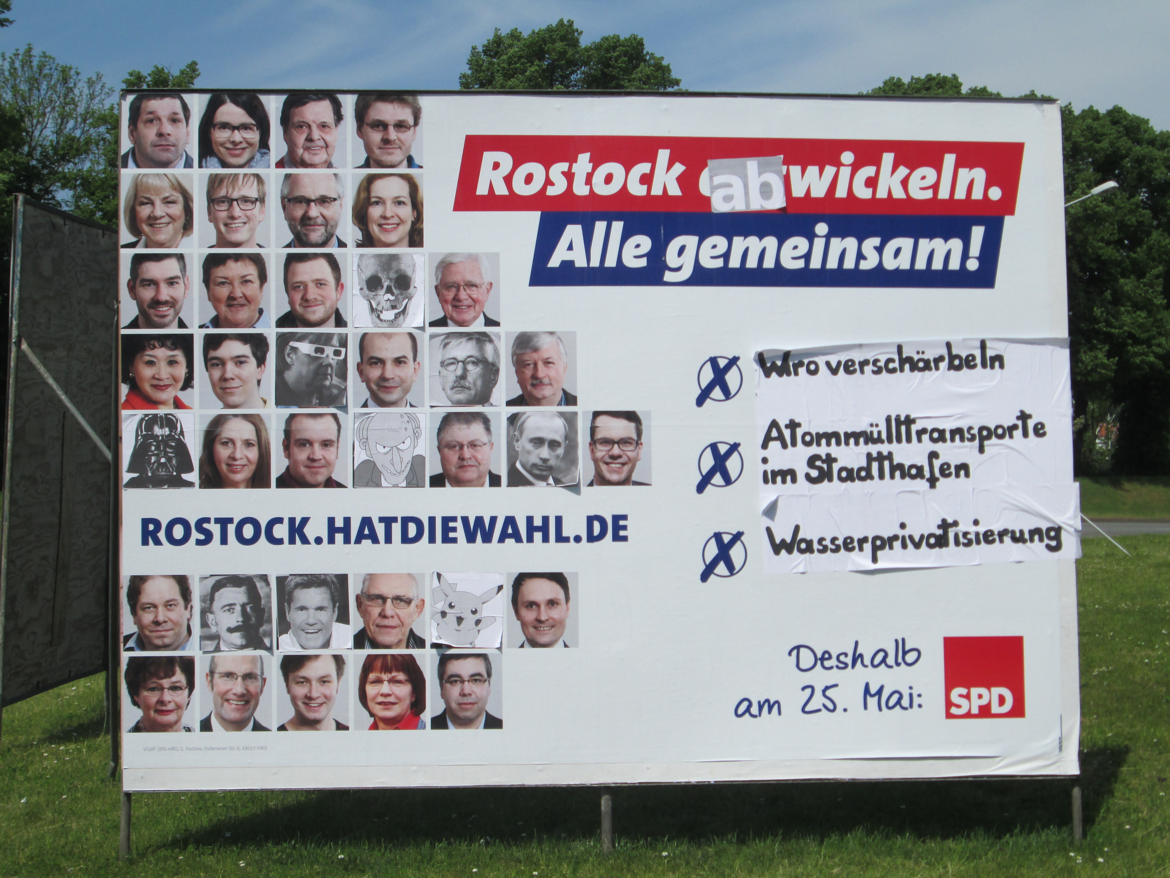 Stellvertretend der SPD lächelt nun Spitzenkandidat Martin Schulz freundlich zum Slogan „Waffenexporte. Kriege. Armut. Aus Deutschland. Für Europa.“ Besonders interessant ist dabei das Kommunalwahl-Motiv der SPD. Unter die Bilder der KandidatInnen hatten sich Darth Vader, Dieter Bohlen, Thilo Sarrazin, Gustav Noske, Pikachu, Vlad Putin, Merkel mit lustiger Brille und ein Totenkopf gemischt, während der Slogan von „Rostock entwickeln“ in „Rostock abwickeln“ verfremdet wurde.