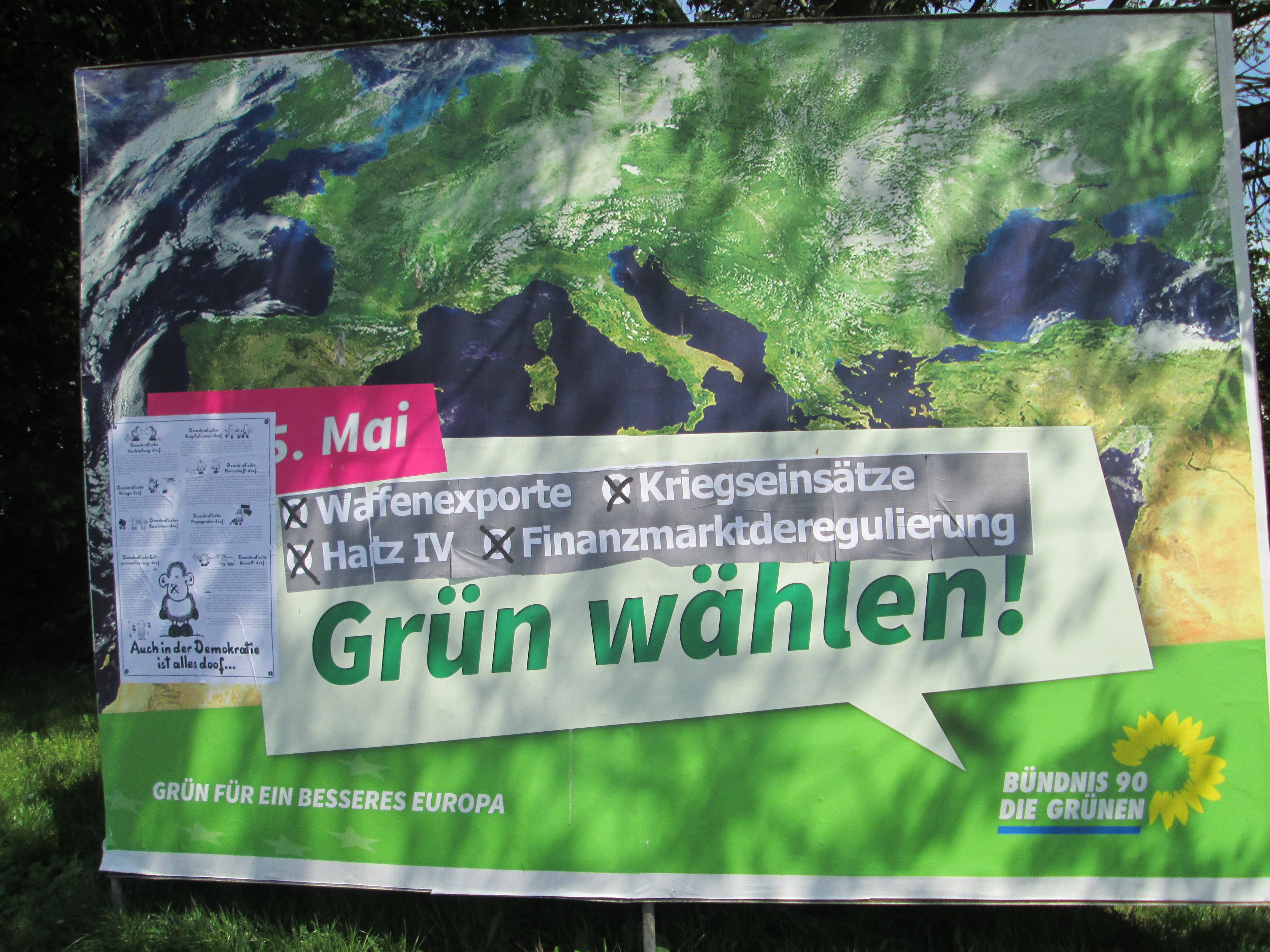 Die Plakate der Grünen wurden mit Wahlkreuzen und den Begriffen: „Waffenexporte. Kriegseinsätze. Hartz4. Finanzmarktderegulierung.“ versehen. Die Vermutung liegt nahe, dass den Grünen hier ihre Verantwortung für Abläufe in ihrer Regierungszeit vorgehalten werden soll.
