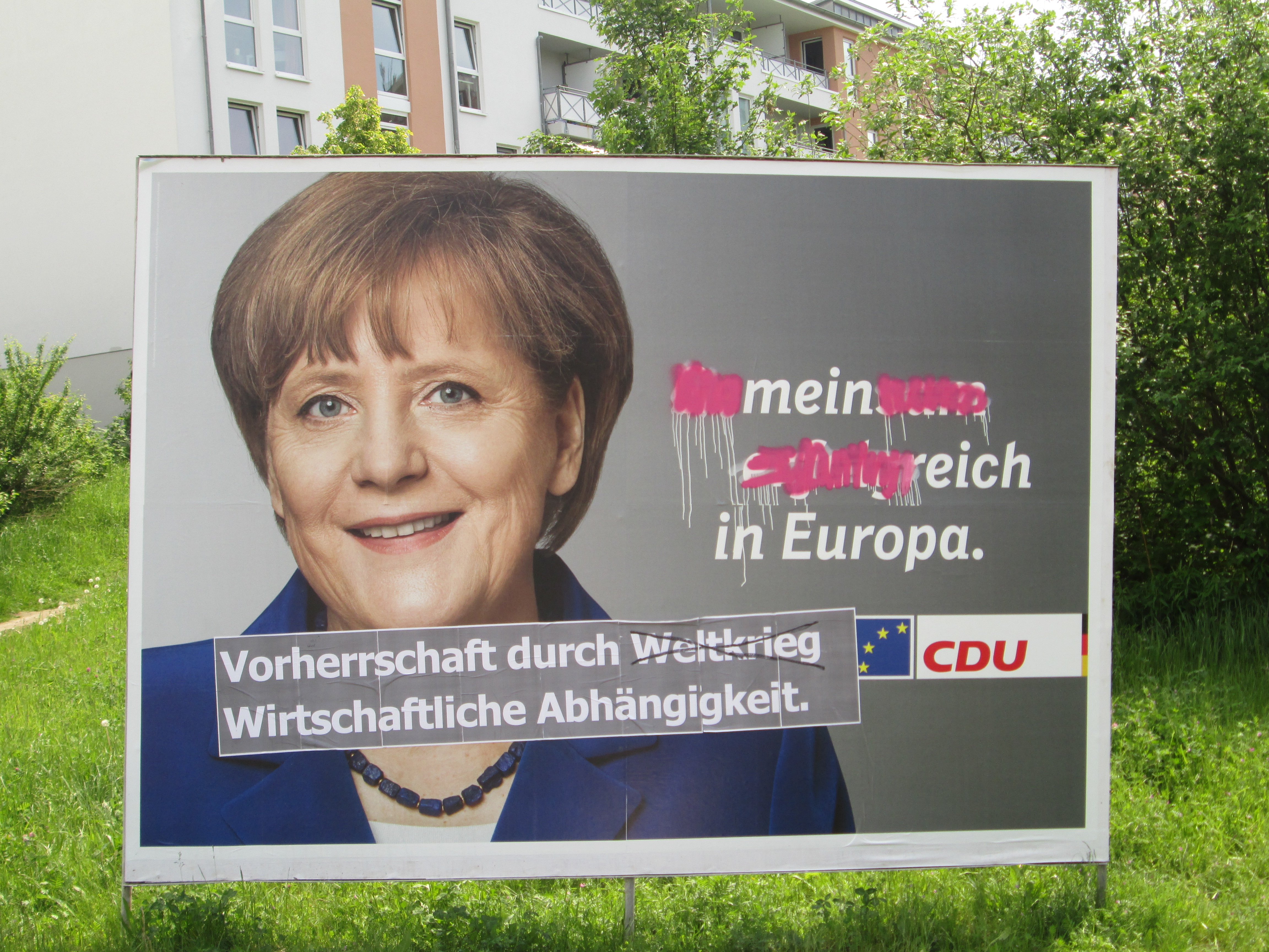 Beim Merkel-Bild der CDU wurde mittels Farbe der Slogan vom „Gemeinsam erfolgreich“ zu „mein reich“ verändert. Ergänzt wurde diese Veränderung mit einer Banderole mit dem Slogan:“ Vorherrschaft durch (durchgestrichen) Weltkrieg. Wirtschaftliche Abhängigkeit“. An einem Plakat wurde zudem leider überflüssiger Weise dem Merkel-Bild ein Hitler-Bärtchen verpasst.