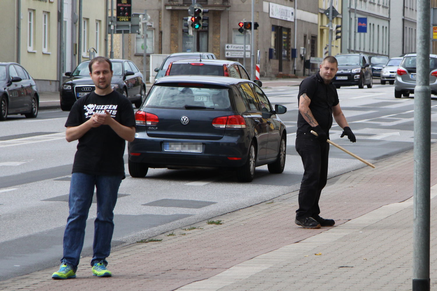 Unterstützt wurden die beiden dabei unter anderem vom NPD-Kandidaten für Teterow (Landkreis Rostock) Adrian Wasner und Christoph Thews, der ebenso wie am vergangenen Wochenende vor „Zutt’s Patriotentreff“ auch heute wieder trotz sommerlicher Temperaturen und strahlenden Sonnenscheins mit Handschuhen unterwegs war.