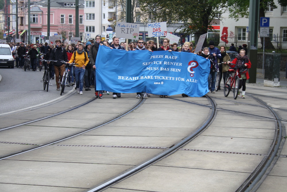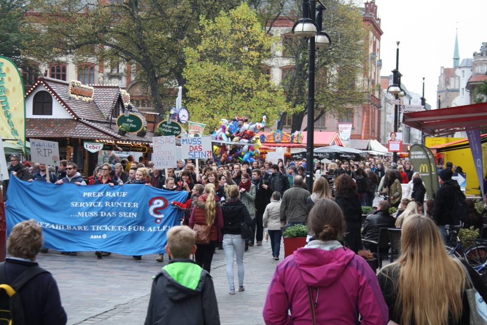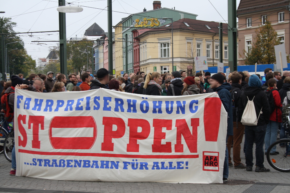 Am Freitag gingen rund 400 Menschen in Rostock gegen die geplante Fahrpreiserhöhung im öffentlichen Nahverkehr auf die Straße. Zeitgleich verhandelten Rostocker Straßenbahn AG und Studentenvertreter_innen über Fahrpreise.