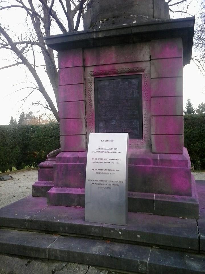 Aber auch dieses Jahr gibt es antifaschistischen Protest. Als ein Teil davon haben wir in der Nacht zum Samstag das Denkmal in rosa Farbe getunkt, um dieses Gedenken zu stören. Dem Volkstrauern einen rosa Strich durch die Rechnung machen! Weil der Volkstrauertag aus dem Gedenkkalender gestrichen und weil jeder Naziaufmarsch, jede rassistische Bürgerinitiative und jeder rechte Parteitag gestört, verhindert und abgeschafft gehört.