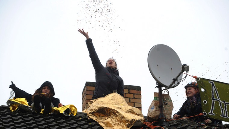 Besetzer_innen neben dem Transparent „Anarchie für eine bessere Zukunft“ werfen Glitzer vom Dach auf die anrückende Polizei. – Von der Brinke kriegt ihr nix, außer Glitzer ins Gesicht! Vor Beginn der Räumung versuchten zahlreiche Unterstützer_innen durch Menschenketten vorm Haus die Polizei am hereinkommen zu hindern. Neben den vielen Menschen im Haus haben einige Aktivist_innen die Polizei vom Dach aus mit Glitzer empfangen und mussten von Spezialpolizist_innen geräumt werden. Zudem hatten sich zwei Aktivist_innen in einem Zwischenboden angekettet. Die Polizei fand sie zunächst nicht und hatte auch dann noch Mühe sie zu räumen und zu trennen.