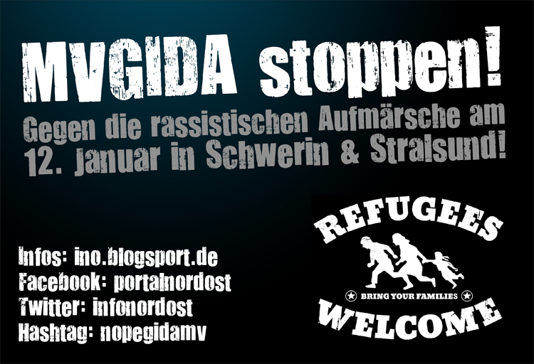 [Original erschienen unter https://de.indymedia.org/node/3271] Nachdem am vergangenen Montag rund 800 Menschen gegen einen geplanten Aufmarsch der rechtspopulistischen ROGIDA in Rostock demonstrierten, sagte der Anmelder Enrico Naumann aus Stralsund den Aufzug für den 12. Januar kurzfristig ab. Alternativ sollen unter dem Label MVGIDA am gleichen Tag in Stralsund und Schwerin Aufmärsche stattfinden. Obwohl der Aufmarsch in Rostock abgesagt wurde, gibt es auch dort verschiedene Aktionen gegen die rassistische Hetze von PEGIDA und co..