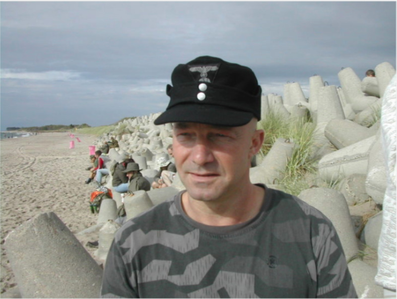 Frank Dreblow mit Reichsadler und Hakenkreuz auf der Mütze