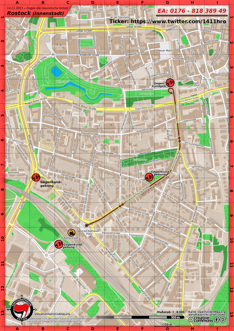 Wir haben für Euch einen Twitter organisiert, den Ihr unter der Adresse https://twitter.com/1411hro erreicht. Dort werdet Ihr aktuelle Informationen zum Aufmarsch und dem Geschehen im Umfeld bekommen. So könnt Ihr schnell und flexibel auf die aktuelle Lage reagieren. Des weiteren wird es am Tag wieder einen Ermittlungsausschuss (EA) geben. Was das genau ist, dass erfahrt Ihr hier. Den EA erreicht Ihr unter 0176/ 818 389 49 Wenn Ihr festgenommen werdet, eure Freunde verhaftet werden, Ihr sie vermisst und nicht mehr finden könnt oder wenn Ihr Festnahmen beobachtet, dann ruft dort an. Beim EA wird Euch kompetent weiter geholfen. Damit Ihr in Stresssituationen die Nummer nicht vergesst schreibt sie Euch irgendwo drauf (Arm, Bein, etc.). Zur allgemeinen Orientierung haben wir auch noch eine Karte für Euch erstellt. Auf dieser Karte seht Ihr die Marschroute, die Gegenkundgebung und einiges mehr. Ihr könnt sie Euch runter laden und ausdrucken, dann habt Ihr am 14.11. einen guten Überblick über das Aktionsgebiet.