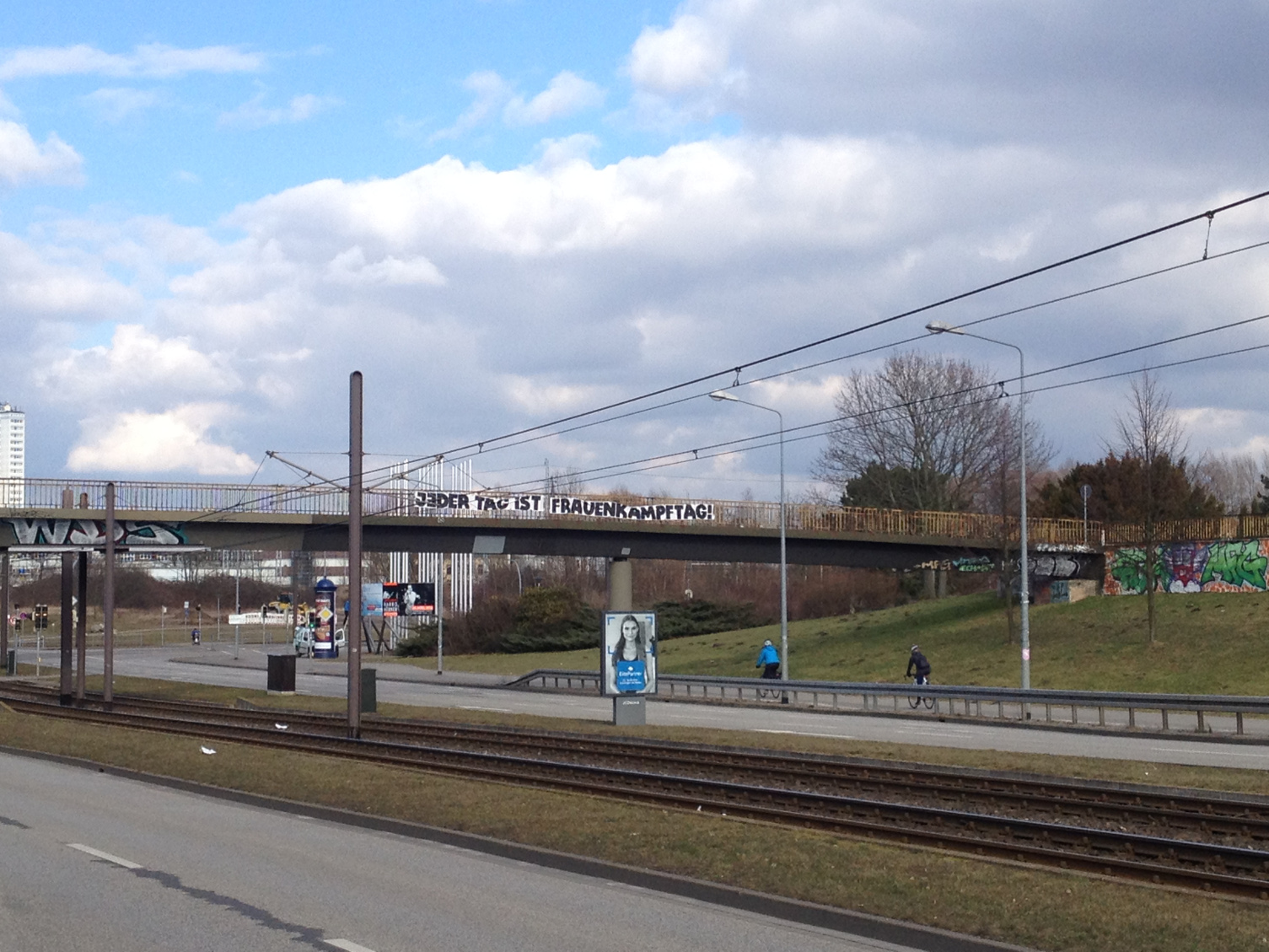 „Jeder Tag ist Frauenkampftag!“, diese Parole konnten Autofahrer_innen und Passant_innen heute in kapitalen Lettern in der Rostocker Südstadt lesen. Mit dieser kleinen Aktion wollen wir darauf hinweisen, dass Frauen weltweit nicht nur am 8. März mit den Verhältnissen zu kämpfen haben. In Zeiten des massiven gesellschaftlichen Rechtsrucks, der Rassismus, Antifeminismus und menschenverachtende Politik zu seinen Kernkompetenzen zählt, ist es uns wichtig einen deutlichen Gegenstandpunkt zu propagieren. Wir zeigen uns solidarisch mit allen unterdrückten Frauen weltweit, die sich erheben und für die Befreiung streiten.