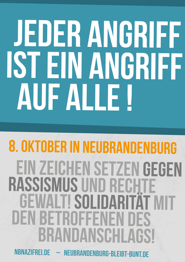 Um diese rassistischen Mordversuche und Übergriffe nicht unkommentiert geschehen zu lassen und Druck gegen Rassismus auf der Straße aufzubauen, wollen Antifaschist_innen aus Neubrandenburg am Samstag auf die Straße gehen. Die Initiative Neubrandenburg Nazifrei! will sich mit den Betroffenen solidarisch erklären und ruft zur Demonstration auf. Hier lautet es: