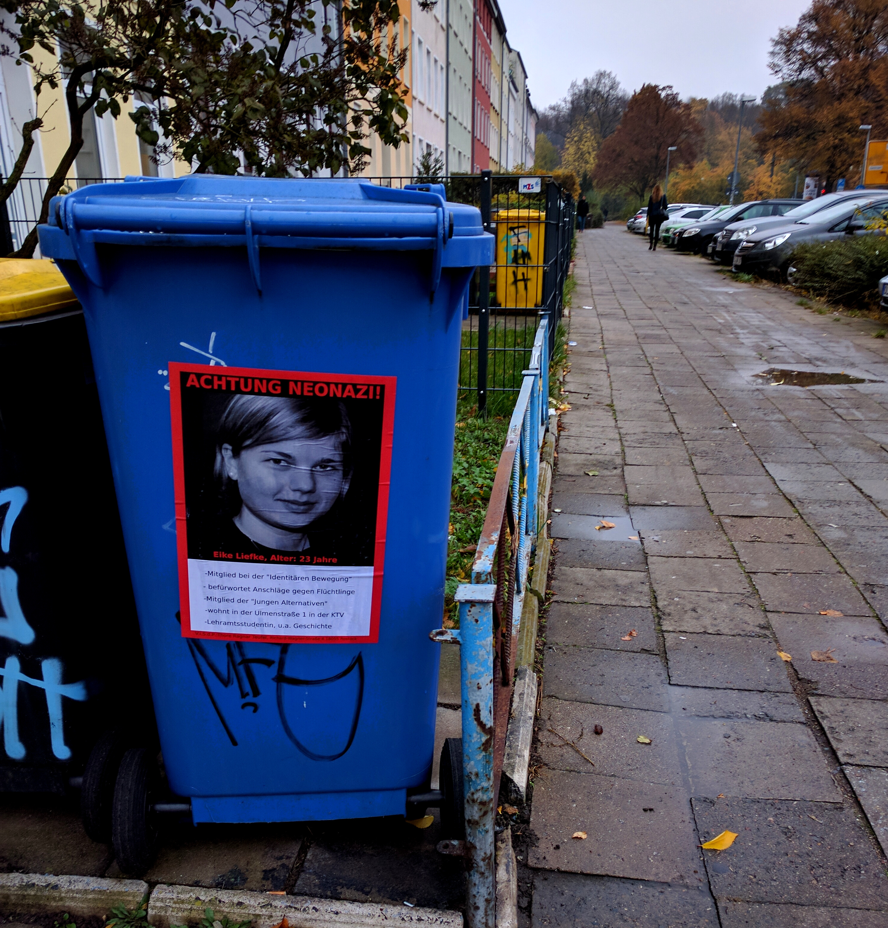 In ihrem direkten Wohnumfeld macht Eike Liefke sich vor allem durch das Kleben rechter Sticker bemerkbar, insbesondere am Saarplatz, also direkt vor ihrer Haustür, tauchen immer wieder Sticker der Identitären Bewegung auf. Außerdem versucht sie alternative Räume zu betreten und dort verkehrende Personen zu provozieren, bspw. durch Fotoaufnahmen. Noch vor einem Jahr pflegte sie regen Umgang mit alternativen Menschen. Damals besuchte sie häufig Partys im PWH, JAZ und Zwischenbau, natürlich ohne ihre Gesinnung zu offenbaren. Äußerungen von ihr in Onlineforen lassen jedoch keinen Zweifel zu, dass sie auch damals schon ein nationalistisches, revisionistisches Weltbild hatte. Ihr früherer Aufenthalt in alternativen Räumen und auch bei politischen Projekten wie der Critical Mass sind als sehr problematisch einzustufen.