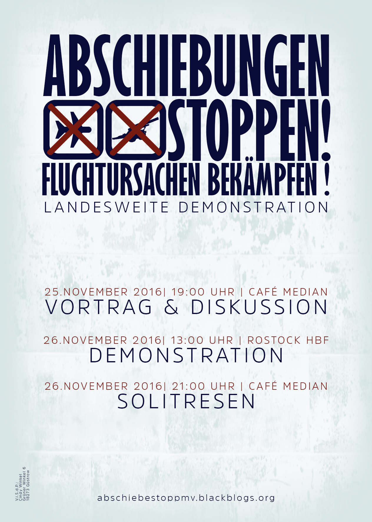 An diese Aktionen will die Kampagne Abschiebestopp M-V nun anknüpfen. Mit einer Demonstration am 26. November in Rostock soll auf die aktuelle Lage aufmerksam gemacht werden. Auf das schamlose inszenieren als Law and Order – Politiker auf dem Rücken der Geflüchteten. Auf die Stimmung im Land, die Abschiebungen zu viel beklatschten Ereignissen macht, die dem Volksmob aber noch lange nicht ausreichen. Auf die verlogene Politik, die von humanistischen Werten schwadroniert, jedoch auch zur kältesten Winterzeit Menschen in die Obdachlosigkeit abschiebt. Auf Kapitalismus und Imperialismus, die die Welt in Krieg, Chaos und Armut stürzen, um den Reichtum in wenigen Regionen, bei wenigen Menschen zu konzentrieren und damit Flucht überhaupt erst begründet.