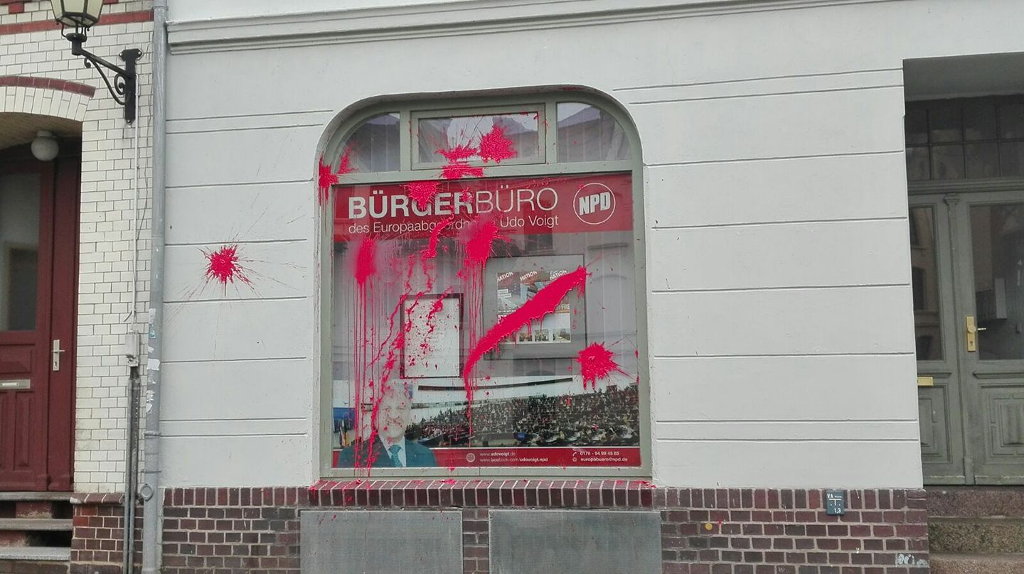 In der Zeit von gestern 19 Uhr bis heute Morgen gegen 7.30 Uhr beschmierten unbekannte Täter die Fassade und die Fensterscheiben eines Wohn- und Geschäftshauses in der Staße „Am Schilde“ in Wismar mit roter Farbe. Im Erdgeschoss des Hauses befindet sich das Bürgerbüro des EU-Abgeordneten der NPD, Udo Voigt. Es wurde Strafanzeige wegen Sachbeschädigung aufgenommen, die Kriminalpolizei ermittelt. Wer Hinweise zur Tat oder zu den Tätern geben kann, meldet sich bitte in jeder Polizeidienststelle.