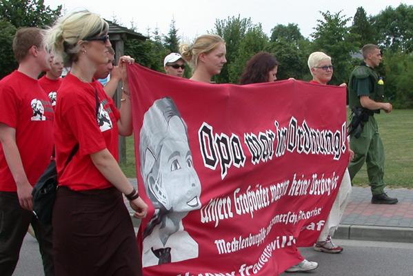 Im Gegensatz zu ihrer aktuellen „Unauffälligkeit“ trat Tomzek vor der Gründung des Kulturkreis wiederkehrend bei rechten Aufmärschen in Erscheinung. So demonstrierte sie z. B. 2003 in Peenemünde (Foto) gegen die vielbeachtete Wehrmachtssaustellung und trug das Fronttransparent der ebenfalls verbotenen Mecklenburgischen Aktionsfront (MAF) im Rahmen der Kampagne „Opa war in Ordnung“, mit der Neonazis versuchten die deutschen Verbrechen im Zweiten Weltkrieg zu verharmlosen. Im Jahr 2007 nahm sie außerdem selbst am von David Petereit maßgeblich organisierten „Leistungsmarsch“ um den Tollensesee teil und versuchte 2004 in Neubrandenburg -auch wieder zusammen mit David Petereit- eine Demonstration gegen Harz 4 zu unterwandern (Foto).