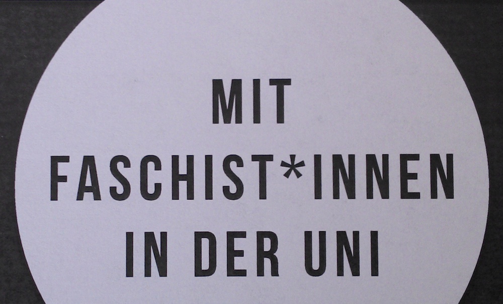 Es ist offensichtlich, dass die ungestörte Anwesenheit von Identitären an der Uni ein unhaltbarer Zustand ist. Wir fordern die Unileitung, sowie alle Mitarbeiter*innen und Studierende auf, sich kritisch mit diesem Phänomen auseinander zu setzen und Strategien gegen FaschistInnen an der Uni zu entwickeln. Das sollte von kreativem Protest in ihren Seminaren bis zur aktiven Suche nach Exmatrikulationsgründen gehen.