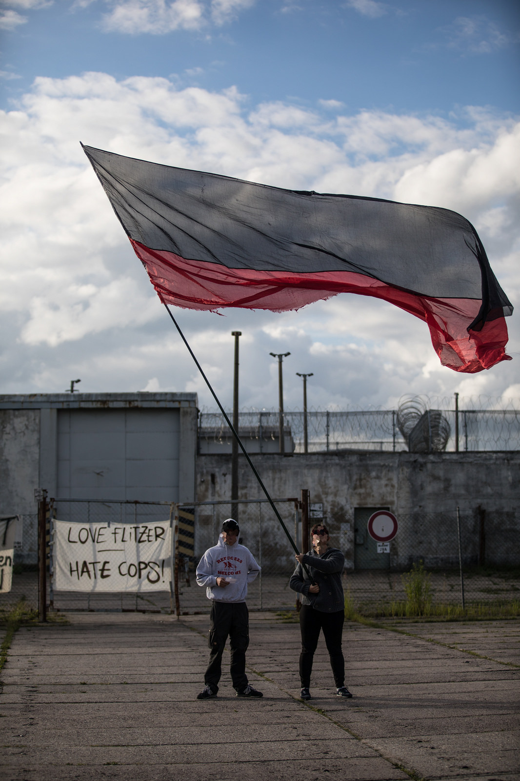 Dass sich die Genoss*innen der Region von Staat und Cops nicht einschüchtern lassen, haben die etwa 80 Aktivist*innen gestern eindrucksvoll bewiesen. Nachdem bereits eine Mahnwache in der Nacht von Sonntag auf Montag vor der Ulmenwache in Rostock die Freilassung von Flitzie verlangte und zur Solidarität mit unseren Genoss*innen aufrief, die derzeit als politische Gefangene festgehalten werden, konnte direkt vor dem Eingangsbereich der JVA Bützow eine Kundgebung abgehalten werden, die das Gefängnis mit Musik, Redebeiträgen und ermutigenden Worten an Flitzie beschallte. Transparente widmeten Sperrbereiche zu Agitationsflächen um, Parolen hallten über den Gefängnishof und womöglich konnte manch ein Häftling über die Knastmauern hinweg einen Blick auf eine imposante Schwenkfahne erhaschen.