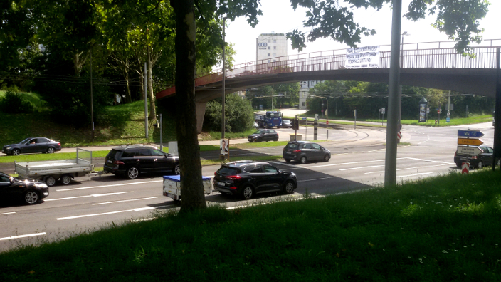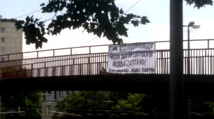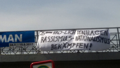Zum 25. Mal jähren sich in diesen Tagen die rassistischen Pogrome von Rostock-Lichtenhagen. Mit zwei Transparenten, welche wir über einer viel befahrenen Kreuzung in Karlsruhe aufgehängt haben, rufen wir dieses Ereignis in Erinnerung.