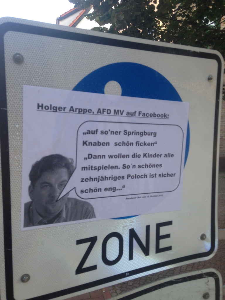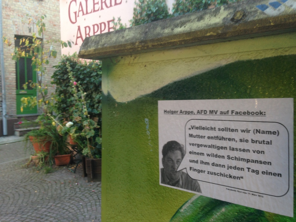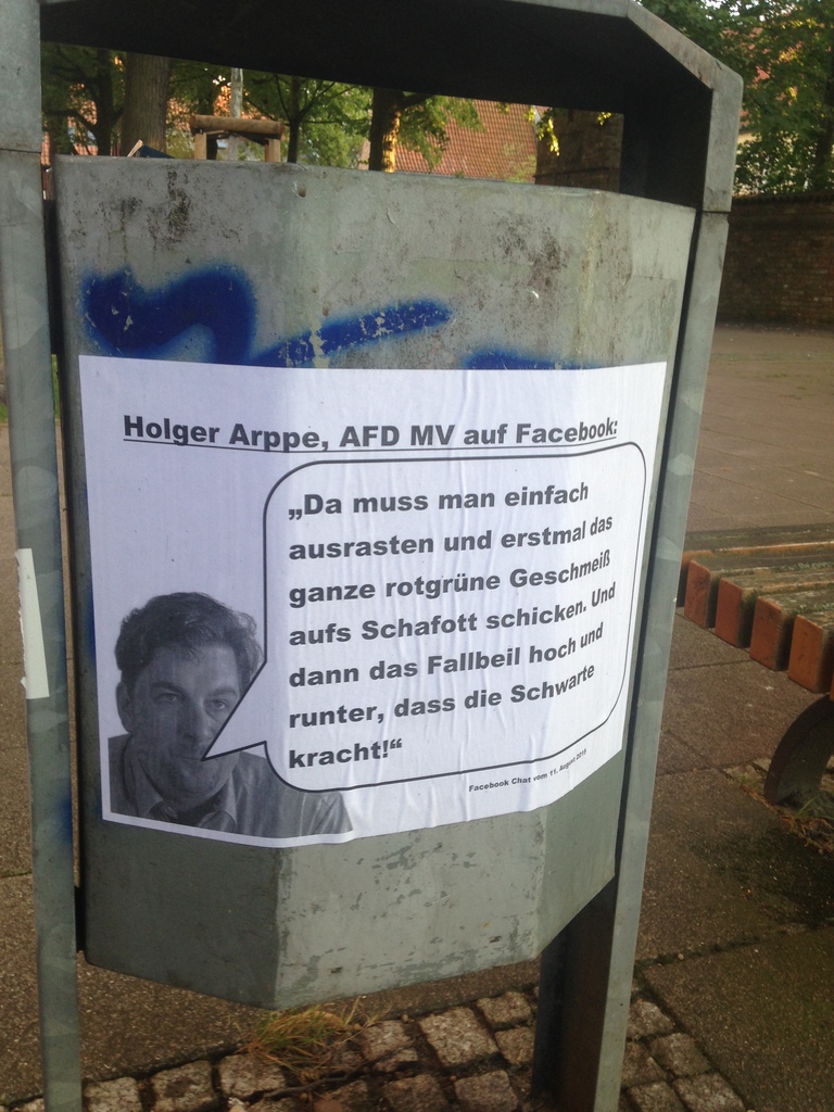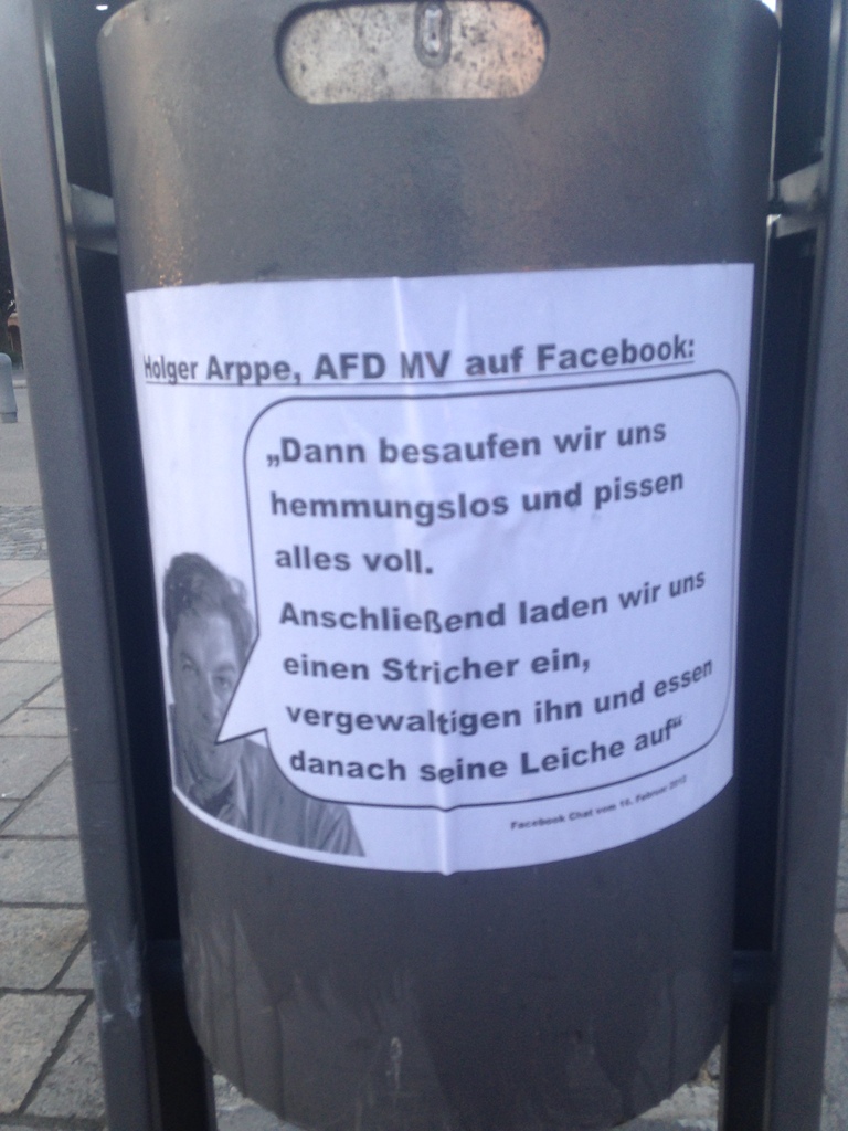 Um weiterhin die Bevölkerung über diese Äußerungen aufzuklären sowie AFD Sympathisanten damit zu konfrontieren wurden, in der Rostocker Innenstadt sowie rund um die Galerie von Holger Arppe, diverse Plakate verklebt.