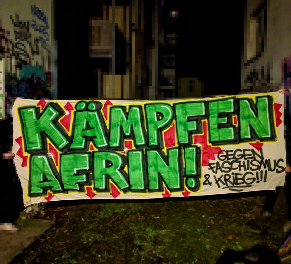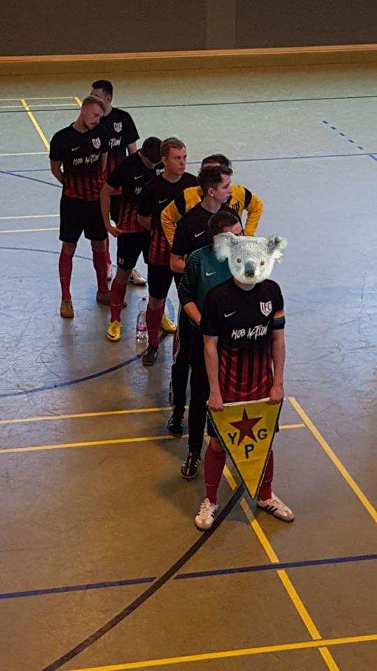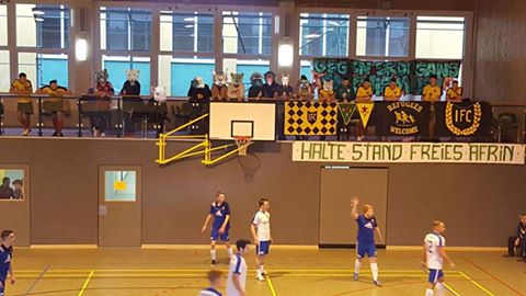 Einer weitere Protestaktion gegen den Einmarsch der türkisch-faschistischen Truppen in Afrin fand während eines Hallenfußballturniers in Lübstorf (MV) statt. Spieler und Anhänger_innen des Internationalen FC Rostock zeigten die Symbole der Selbstverteidigungseinheiten und Spruchbänder mit den Parolen „Halte stand freies Afrin!“ und „Gegen Erdogans Faschismus!“. Zudem betonten die Spieler, dass internationale Solidarität zum Schutze des fortschrittlichen Projektes in Nordsyrien mehr denn je nötig ist. Darüber hinaus prangerten sie insbesondere die deutsche Rolle bei der Bewaffnung des Aggressoren Türkei an.