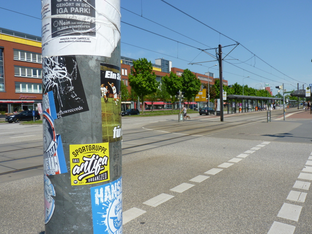 Auch der Stadtteilspaziergang fand heute zum wiederholten Male statt. Es wurde unter anderem ein Flyer verteilt, der über die menschenverachtenden, rassistischen und extrem rechten Einstellungen der AfD aufmerksam macht und die Widersprüche in ihren politischen Inhalten aufzeigt. Während die Antifaschist_innen in Lütten Klein Nazi-Propaganda entfernten, gab es zeitgleich eine lächerliche Aktion des neonazistischen Aktions Block Rostock (NSR). In männlich sozialisierter Manier posierten sie vor einigen linken Projekten, verklebten „Heil Hansa“ Sticker der Hansafans Malchin, machten Selfies und feierten sich als die harten nationalen Widerstandskämpfer ab. In einem kurz darauf veröffentlichten Artikel der Neonazis kündigen sie weitere Aktionen gegen linke Projekte in Rostock an.
