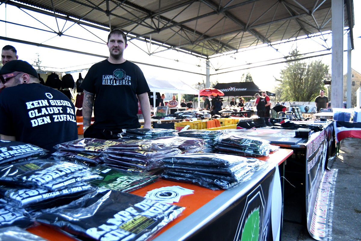 Im Rückblick auf das Turnier stellen wir erneut fest, dass sich Events wie der KdN immer mehr professionalisieren und in ihrer Struktur an Zuwachs gewinnen. Neben den seit Jahren involvierten Neonazi-Kampfsportmarken „White Rex“, „Greifvogel Wear“, „Black Legion“, „Sport Frei“ und „Pride France“ kamen nicht nur neue Marken wie „Blutzoll“ dazu, sondern auch Labels und Produktionen aus der RechtsRock-Szene, wie etwa „Wewelsburg Records“. Mit den Köpfen hinter diesem Geschäftszweigen gewann die Struktur zudem an Personen aus den Reihen der Neonazi-Bruderschaft „Hammerskins“. Diese schickte auch internationale Vertreter nach Ostritz um im Rahmen des KdN Aufgaben zu übernehmen.