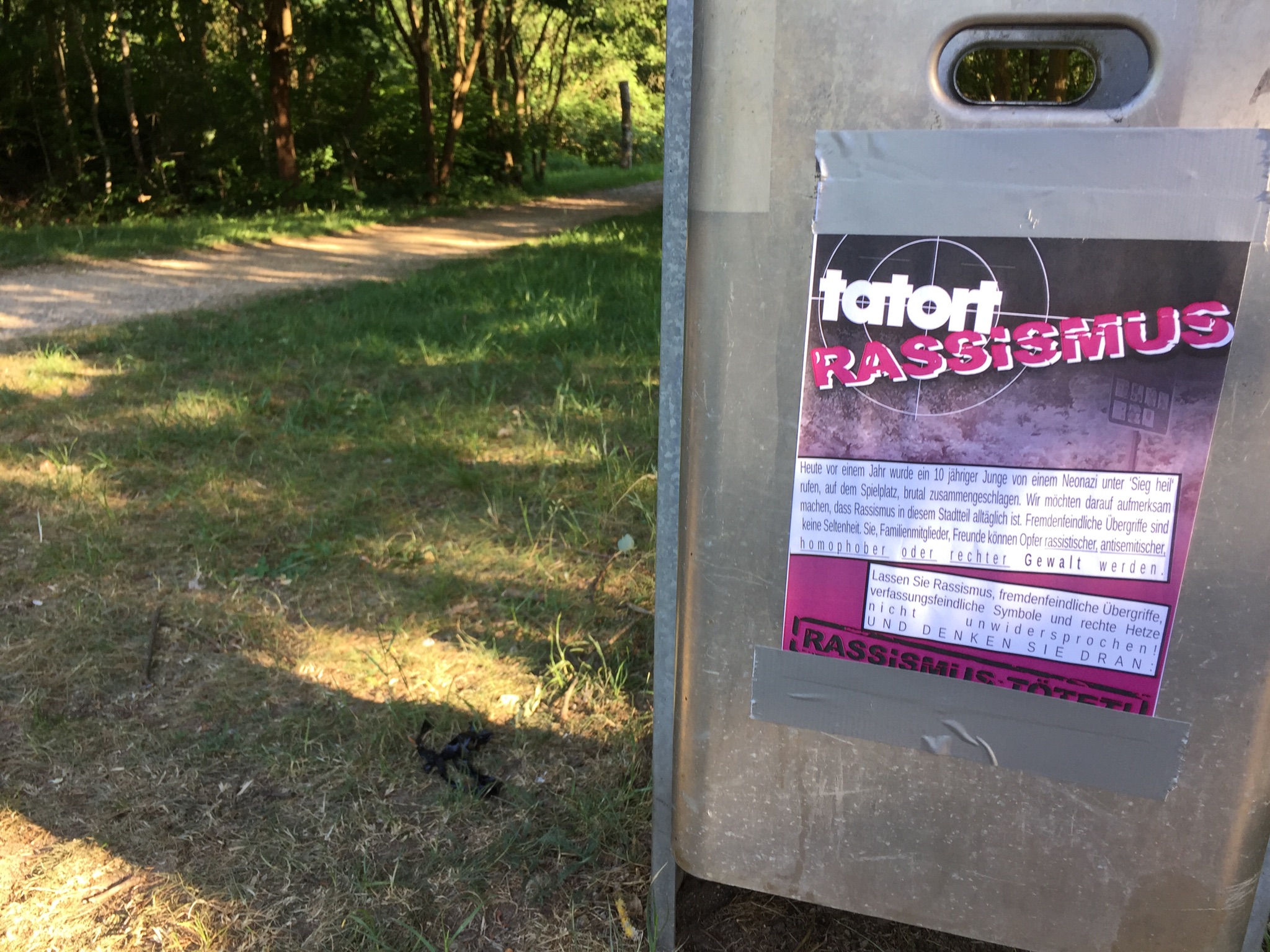 [Original erschienen unter https://de.indymedia.org/node/21282] Heute jährt sich sich der brutale Übergriff auf einen 10 jährigen Jungen durch einen Neonazi in unserem Viertel. Am Herrentag 2017* wurde der Junge unter „Sieg Heil“ rufen, im Freizeitpark Neu Zippendorf, brutal zusammen geschlagen. Er erlitt dabei massive Schwellungen im Gesicht, mehrere Hämatome, ein aufgeplatztes Auge und ein blutendes Ohr Nur das Einschreiten einer Gruppe afrikanischer Männer konnte schlimmeres Verhindern. Vor dem Angriff hat der Neonazi mit seinen Kameraden im Freizeitpark Herrentag „gefeiert“ und Nazilieder gesungen.