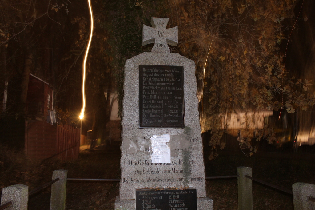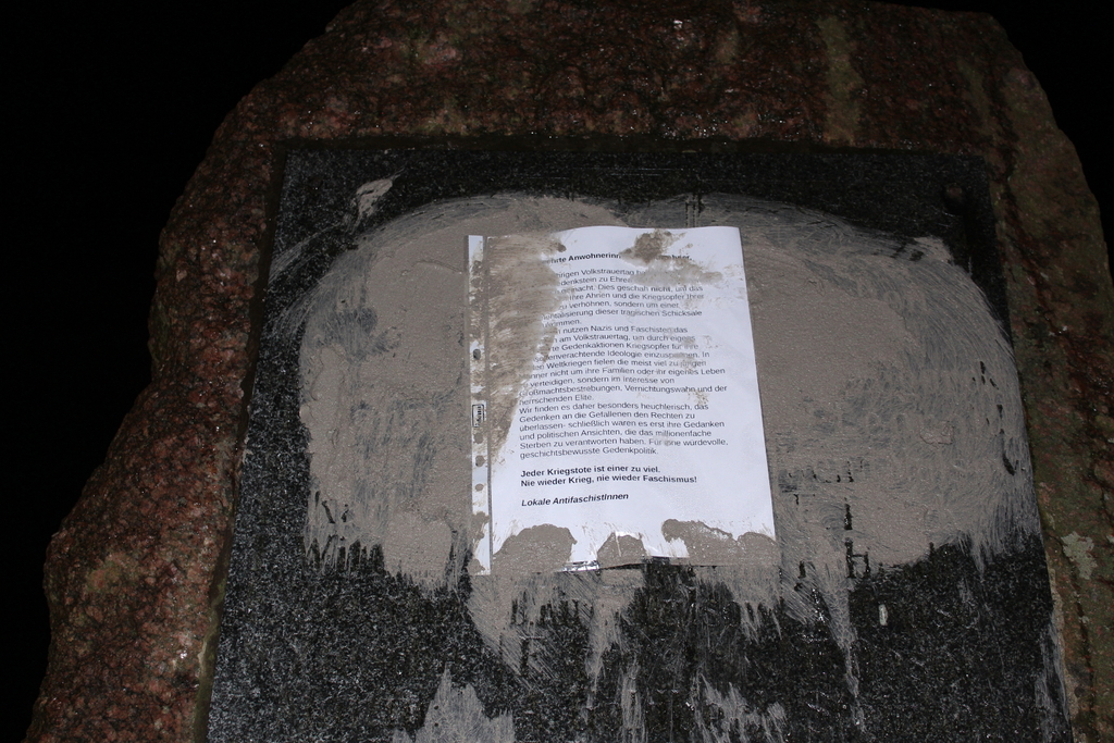 zum diesjährigen Volkstrauertag haben wir den hiesigen Gedenkstein zu Ehren der Kriegsgefallenen unkenntlich gemacht. Dies geschah nicht, um das Gedenken an Ihre Ahnen und die Kriegsopfer Ihrer Gemeinde zu verhöhnen, sondern um einer Instrumentalisierung dieser tragischen Schicksale zuvorzukommen.