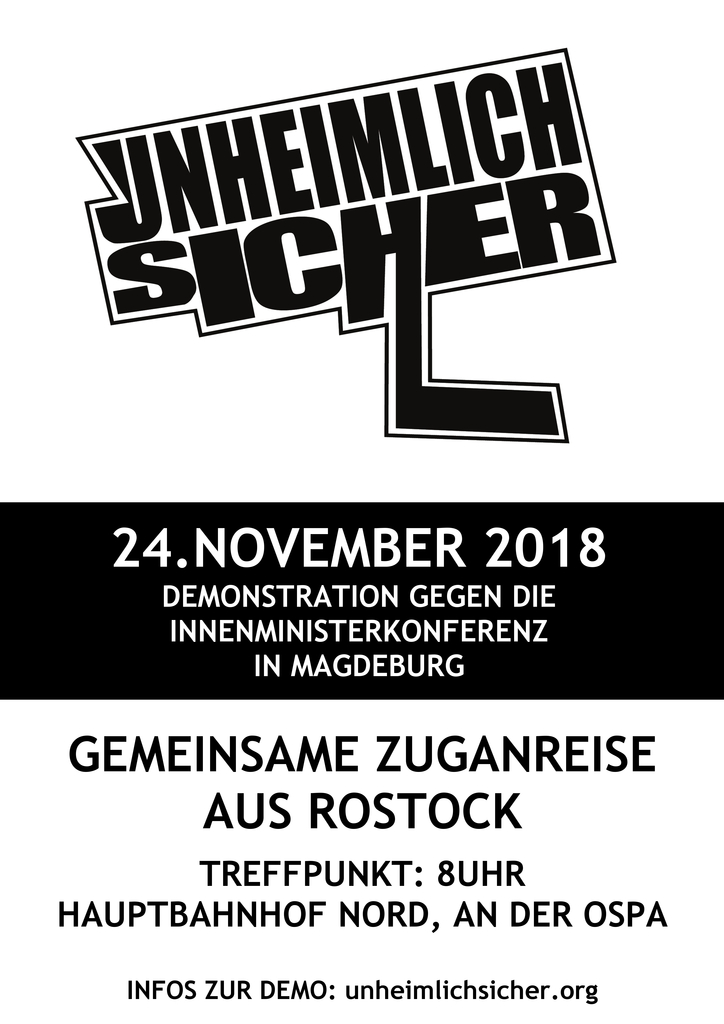Letzte Infos: 24.11. Zuganreise aus Rostock zur Demonstration »Unheimlich Sicher« gegen die Innenministerkonferenz in Magdeburg