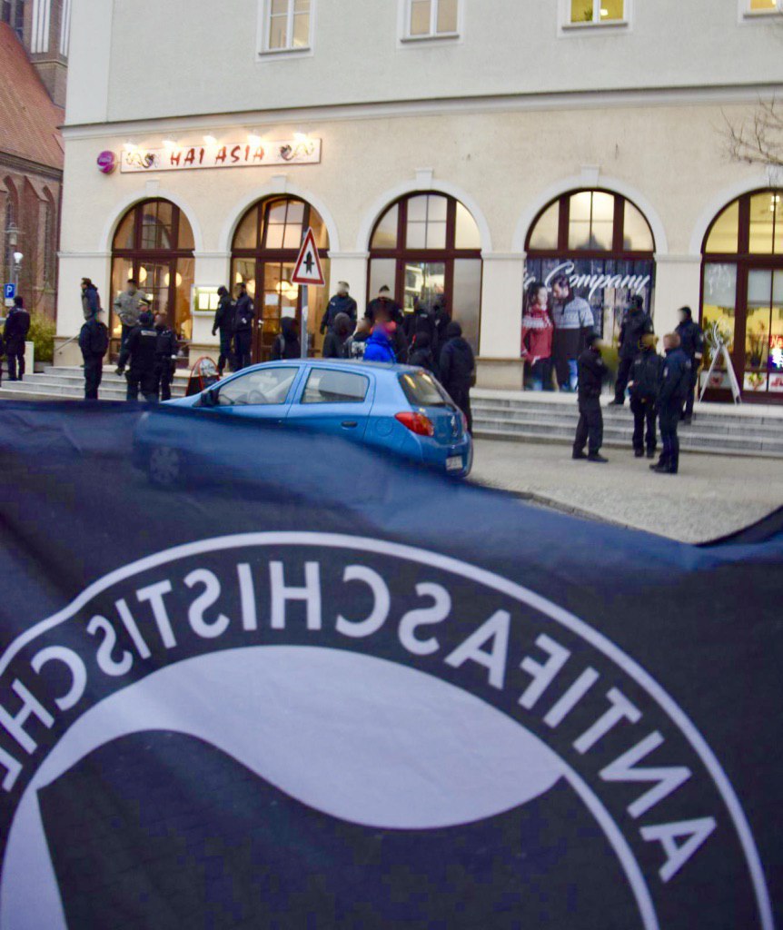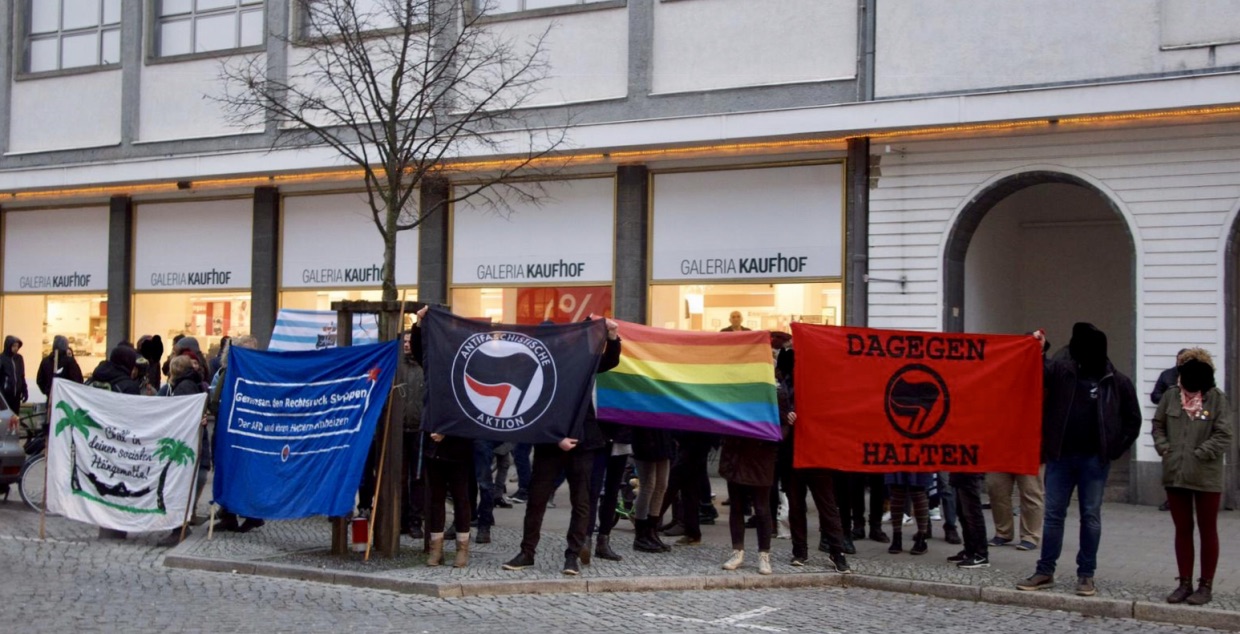 Heute haben sich auch gleich spontan etwa 80 Personen am Laden versammelt, um ihren Protest mit größerem Polizeiaufgebot friedlich kund zu tun.