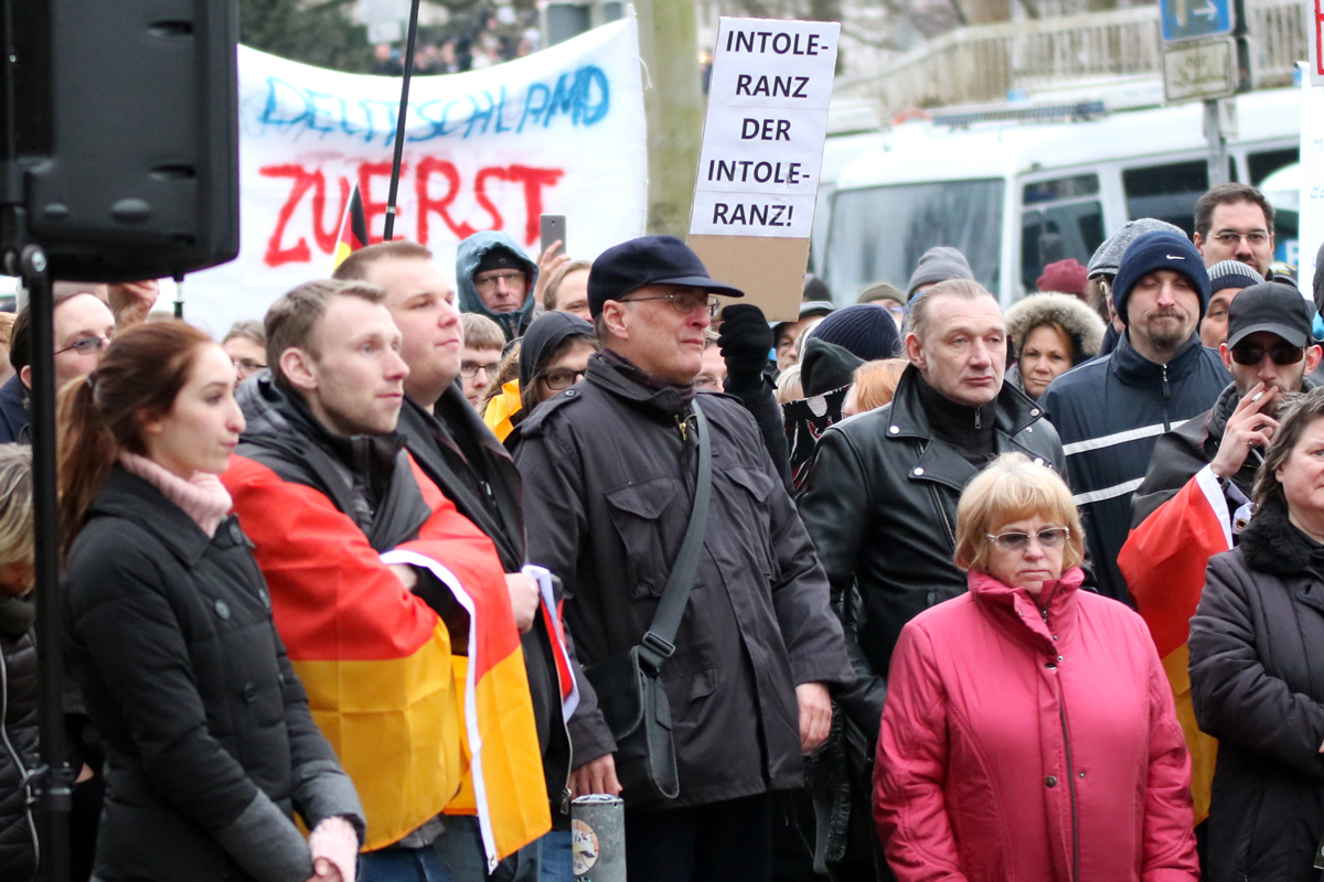 Unterstützung bekommt die Hamburger Veranstaltungsreihe aber auch von der AfD aus Schleswig-Holstein. Annette Walther, derzeit als Fraktionslose Mitglied im Stormaner Kreistag, ist treue und regelmäßige Besucherin der rassistischen Aufmärsche. Am 7. November letzten Jahres stieg Walther auf die berühmt gewordenen Getränke-Kisten der Kundgebung und hielt eine Rede. Wie scheinheilig ihre Forderung nach einem Rücktritt von Arnulf Fröhlich (Fraktionsvorsitzender AfD-Stormarn) ist, weil dieser 1990 an einer Neonaziveranstaltung teilnahm, wird hier offensichtlich. Dass sie in Hamburg regelmäßig mit Neonazis an den Veranstaltungen teilnimmt, lässt ihren Vorstoß gegen Fröhlich nur als konkurrierendes Geschacher um Spitzen-Posten wirken.