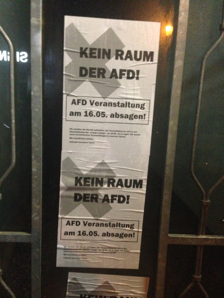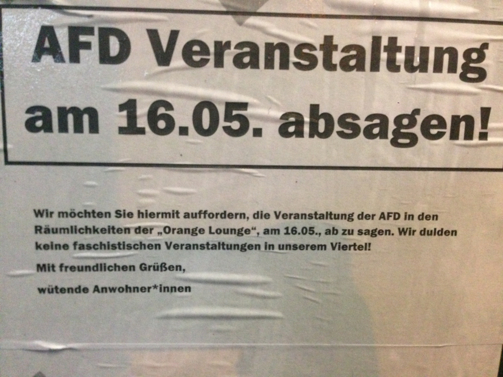 Wir fordern das die Veranstaltung abgesagt wird! Wir dulden keine rechten Veranstaltungen in unserem Viertel und auch keine Unternehmen die rechten Hetzern eine Bühne bieten. Um dies deutlich zu machen haben wir in der vergangenen Nacht die „Orange Lounge“ sowie die Privat- und Geschäftsadresse des Betreibers großflächig mit Plakaten verschönert.