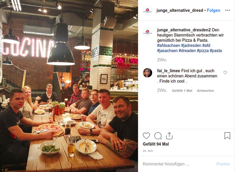 Die beiden Letzteren bewegen sich außerdem in dem Kreisen der «Junge Alternative» (JA) in Dresden – die Jugendorganisation der «Alternative für Deutschland». So nahm Fabian Rösner zuletzt im Mai 2019 an einem Stammtisch der JA in Dresden teil.