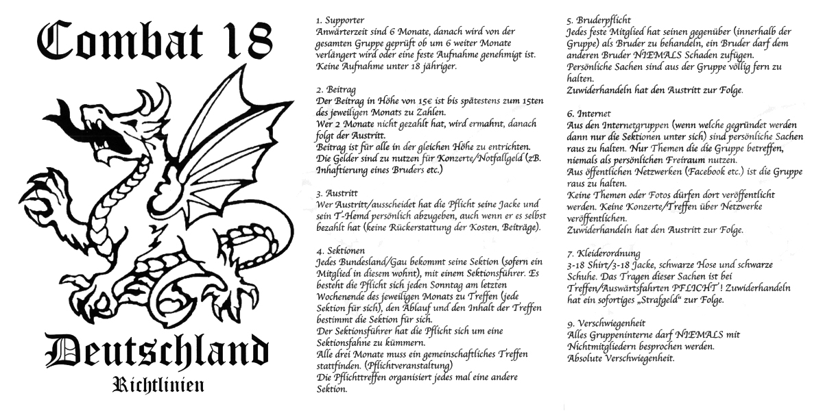 B&H/C18 in Deutschland ist eine geschlossene Personengruppe – eine Organisation mit einem Regelwerk, festen Strukturen und einem exklusiven Anspruch auf das Label «Combat 18». Sie formierte sich ab 2012 als deutscher Ableger eines internationalen «Combat 18»-Netzwerks und unterhält mehrere regionale Sektionen. Auch werden ganze Gruppen (wie im März 2019 die «Brigade 8») in C18 Deutschland aufgenommen. Wie die Richtlinien zeigen, gibt es Pflichttreffen, Mitgliedsbeiträge und Mitgliedskleidung, sowie Funktionen als Sektionsleiter oder Kassenwart. Es gibt Vollmitglieder und Mitglieds-Anwärter. Auf der Vorderseite der verschriftlichten Richtlinien prangt das Organisationssymbol des C18-Drachen. Dieses Erkennungszeichen findet sich international in allen Divisionsabzeichen und auf Kleidungsstücken der Mitglieder.