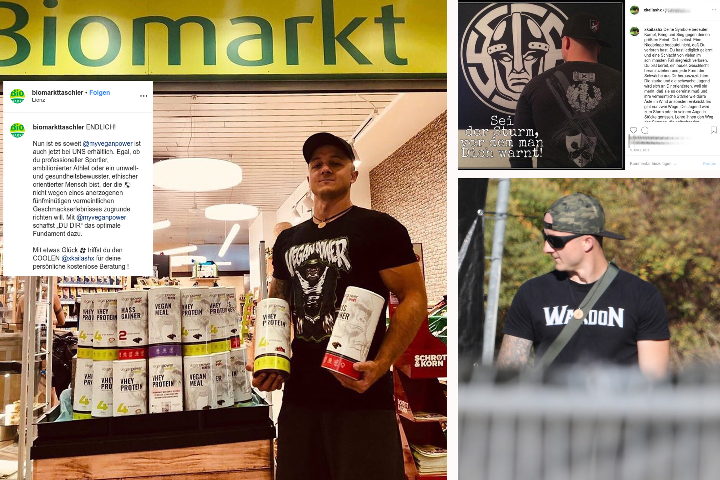 „Mit etwas Glück triffst du den COOLEN xkailashx für deine persönliche kostenlose Beratung“, schreibt der Biomarkt auf Instagram und verlinkt dabei Manuel „xkailashx“ Eder. Seine Betätigung in der europaweit organisierten Neonazi-Szene scheint „veganpower“ und den Biomarkt nicht zu stören. Die Informationen zu seiner Person sind seit Jahren im Internet offen einsehbar und auch sein Profil in den sozialen Netzwerken spricht Bände. Stattdessen scheint sein Anbiedern an die vegane Kraftsportszene Früchte zu tragen. Seine Postings in den sozialen Netzwerken werden schließlich auch von Protagonist_innen dieser Szene geteilt.