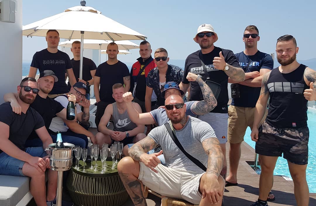 Mallorca 2019: Eric Bluhm (oben, 3.v.r.) mit Wolfgang Benkesser (im Vordergrund). Hinter Benkesser, leicht verdeckt: Philipp Burmeister, umgeben von Anhängern der Neonazi-Hooligangruppe „Nordische Wut“