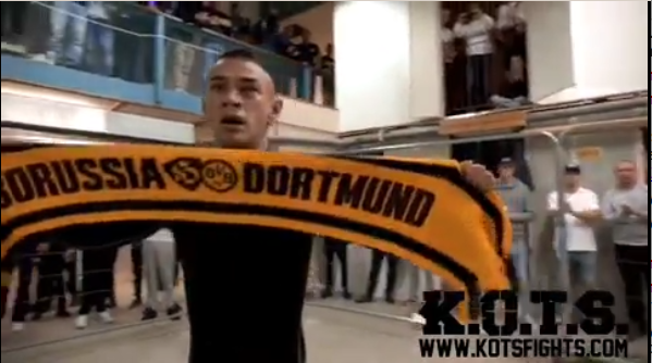 Screenshot aus dem Video von Neuberts Kampf beim KOTS im September 2019. Er präsentiert einen Schal der Hooligans von Borussia Dortmund