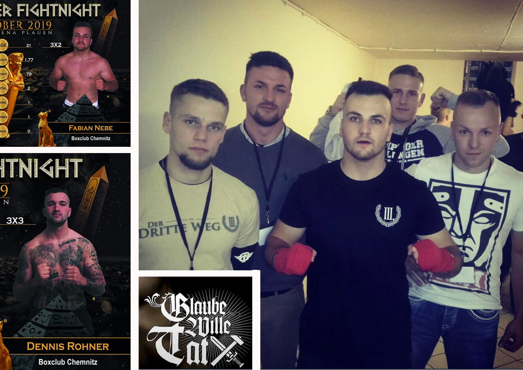 Vom „Boxclub Chemnitz“ werden für das Event in Plauen hingegen gleich zwei Neonazis in den Ring geschickt. Der eine, Fabian Nebe, war schon beim „Kampf der Nibelungen“ 2017 einer der Kämpfer der „AG Körper & Geist“. Die „Arbeitsgruppe“ wurde von der Neonazi-Partei „Der III. Weg“ initiiert und hat sich auf die körperliche Erziehung von Neoanzis, u.a. durch Kampfsport, spezialisiert. Nebe nahm darüber hinaus auch am „2. Tag der Gemeinschaft“ der Partei am 10. August 2019 in Zwickau teil. Bekleidet mit einem T-Shirt der Partei trat er mit weiteren Neonazis für ein Fußballspiel an.