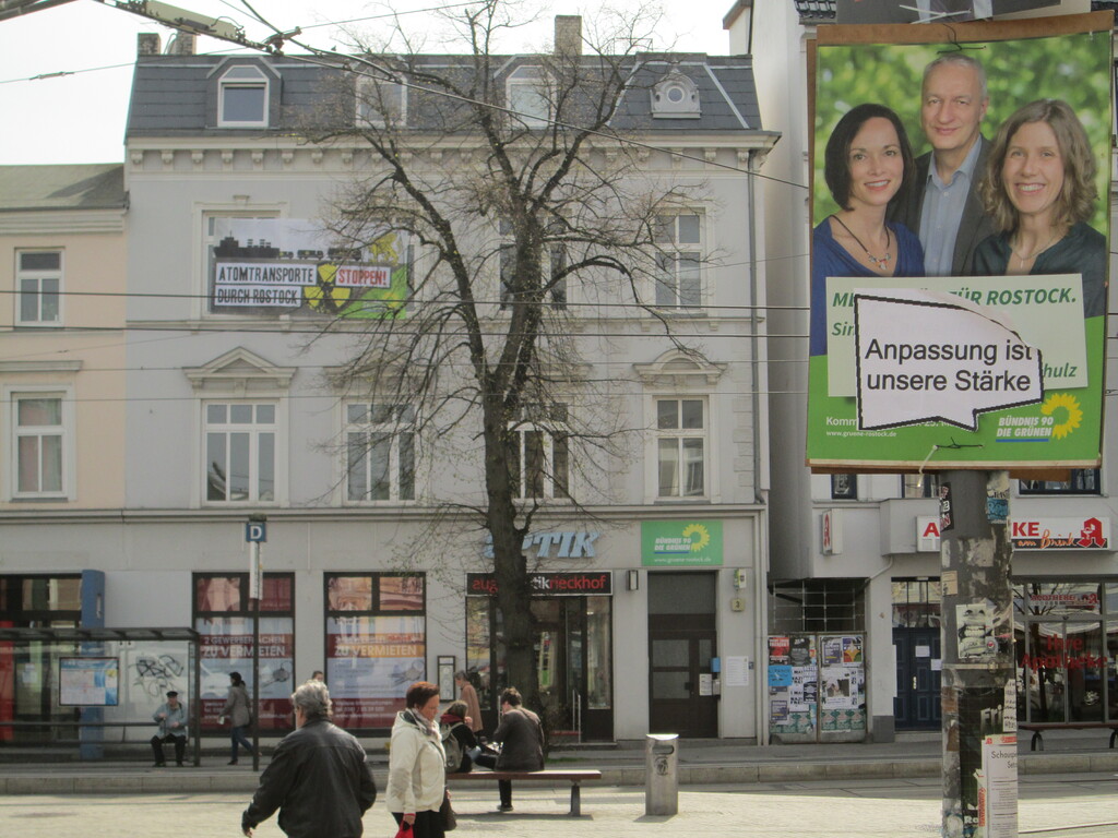 Ähnlich sah es auch bei den Grünen und der SPD aus. Den Grünen wurden die „Erfolge“ Krieg, Hartz-IV und 40 Jahre Betriebsgenehmigung für Atomschleudern vorgehalten. Bei der SPD wurde unter dem Titel „Rostock abwerten“ die Verscherbelung der städtischen Wohnungen und die Atommülltransporte im Hafen kritisiert. Auch das dürften Themen gewesen sein, die die Unterstützer*innen der Grünen und der SPD durchaus kennen, aber meistens elegant verdrängen.