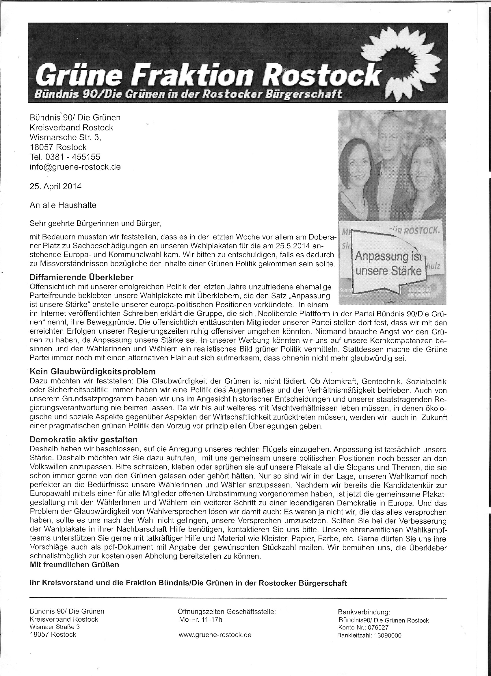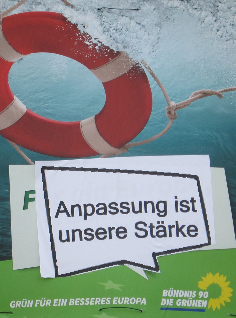 Den Effekt des Neuen nutzten zu Beginn des Wahlkampfes 2014 die Kommunikationsguerill@s in Rostock-Downtown. Dort logiert die Grüne Partei mit der mecklenburgischen Landesgeschäftstelle. Prominent und massiv hatten die Ökos die Laternenpfähle drumherum mit Plastikmüll in Form von Wahlplakaten dekoriert. Diese Plakate wurden bereits in der ersten Wahlkampfwoche mit dem Slogan „Anpassung ist unsere Stärke“ zu versehen.
