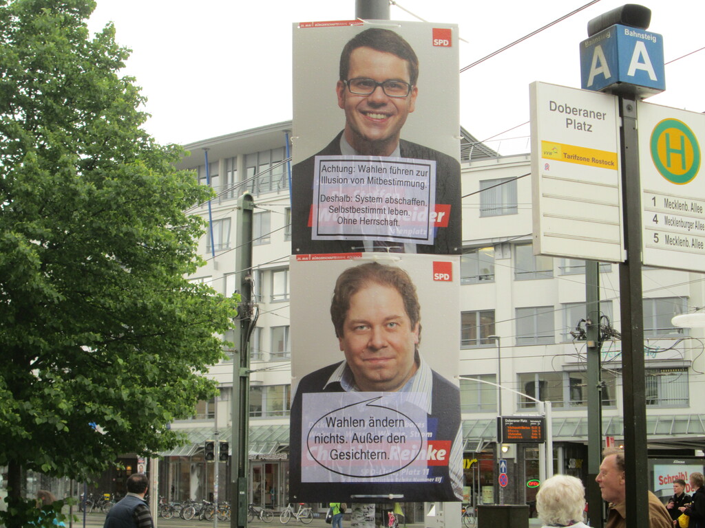 Mit diesem Aktionserfolg im Rücken gelang den Chaot*innen offensichtlich eine breitere interne Mobilisierung, denn seitdem war Adbusting aus dem Stadtbild der Innenstadt nicht mehr wegzudenken. Auf großen wie kleinen Plakaten begegneten den Rostocker*innen für den Rest des Wahlkampfes fast täglich neue Umgestaltungen der Wahlwerbung.