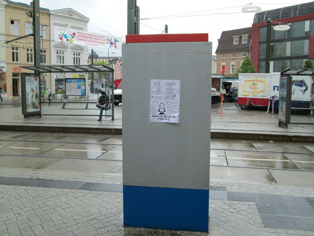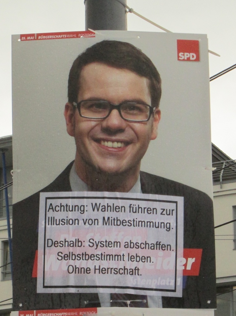 Doch bieten genau diese Legitimationsbeschaffungsfestspiele eine gute Plattform, um das schwer zu fassende Konstrukt Herrschaft, kritisierbar und damit angreifbar zu machen. Das Aktionsformen-Arsenal der Kommunikationsguerilla stellt zudem ein breites Sammelsurium an Möglichkeiten bereit. Eines der wenigen Beispiele für eine gelungene Kombination verschiedener Aktionsformen findet sich 2014 in Rostock bei den gleichzeitig stattfindenden Europa- und Kommunalwahlen.