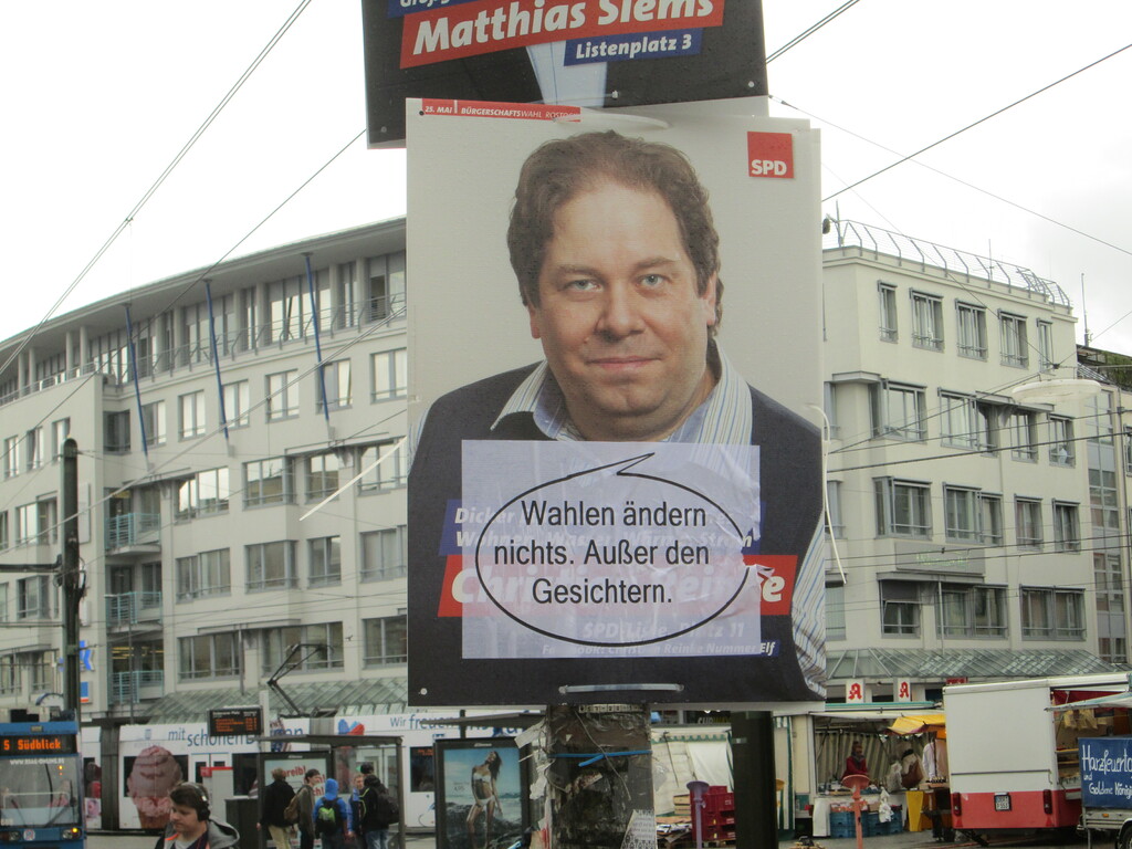 [Original erschienen unter https://de.indymedia.org/node/52630] Sie jähren sich regelmäßig, nur die Hälfte geht hin und trotzdem kommt keiner an ihnen vorbei: Wahlen. Durch die schiere Flut an Wahlwerbung sind sie eine Einladung an jede*n Kommunikationsguerill@. Durch die rund um die Wahlen erzeugte diskursive Bühne bietet es sich besonders an, gesellschaftlich unhinterfragten Konstrukte, wie Herrschaft, sichtbar zu machen. Das gilt besonders, wenn man dabei verschiedene Aktionsformen geschickt mit Adbusting