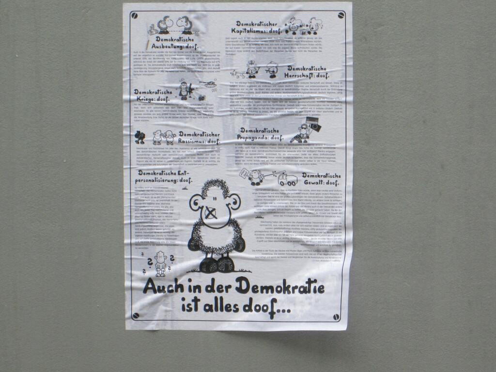 Das Spektrum reichte dabei von anarchistischer Propaganda a la „Wahlen ändern nix. Außer die Gesichter“ in Sprechblasenform auf den Gesichtern der Kandidat*innen, über spezielle Kritik an der jeweiligen Partei, bis hin zu konkreter Kritik an der Stadtpolitik der jeweiligen Partei. Um auch Vermittlung zu gewährleisten, plakatierten die Chaot*innen darüber hinaus ein Plakat mit dem beliebten „Ohne dich ist alles doof“-Schaf. Das erklärte stichpunkthaft, was an demokratischer Herrschaft alles kritikwürdig sei.