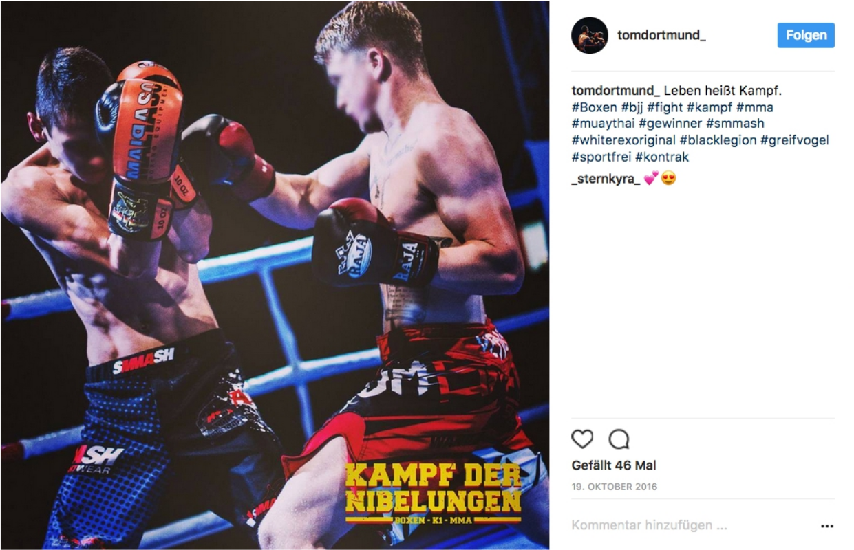 Angesprochen von rechter Bekleidung und neonazistischen Organisationen scheint auch Weiße außerhalb des Gyms. In den sozialen Netzwerken präsentiert er sich mit Klamotten der Neonazi-Marken „Ansgar Aryan“ und „Thor Steinar“, mag die RechtsRock-Band „Die Lunikoff Verschwörung“ und weist in seinem Account auf das rechte Kampfsportformat „Kampf der Nibelungen“ hin.