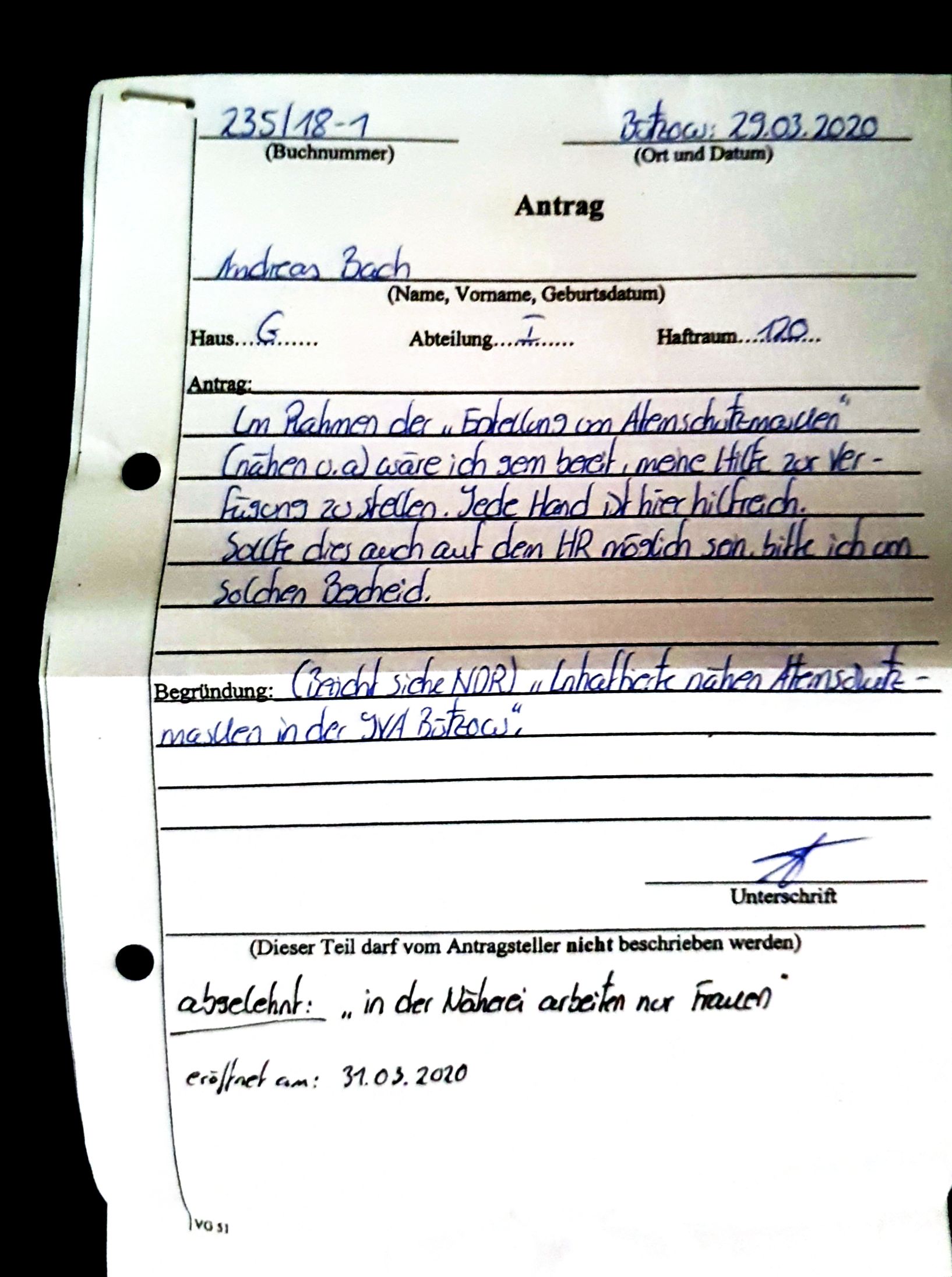 Der Knast wirbt damit, dass angeblich alle Gefangenen Atemmasken nähen würden. Faktisch nähen im Knast Bützow aber nur drei Frauen. Andreas stellte deswegen einen Antrag (siehe Bild unten), in dem er anbot, u.a. beim Nähen der Masken behilflich sein zu können. Der Antrag wurde mit der Begründung, in der Näherei arbeiten nur Frauen, abgelehnt. Wieder einmal zeigt Knast damit ganz offensichtlich sein ausbeuterisches und patriarchales Gesicht, welches der Knast öffentlich versucht zu vertuschen.