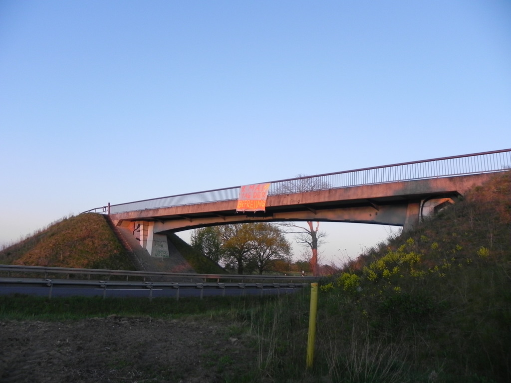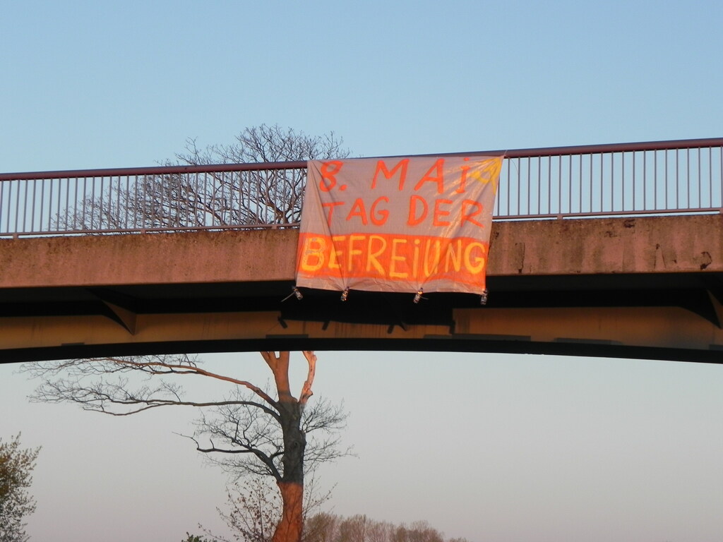 In der Nacht vor dem 8. Mai haben wir 2 Transparente mit der Aufschrift „8. Mai Tag der Befreiung“ an eine Brücke über die B105 bei Ribnitz-Damgarten angebracht. Wir wissen, dass es eine symbolische Aktion ist .Aber auch diese Aktion ist wichtig um die Forderung 8 Mai als Feiertag zu unterstützen. Der 8 Mai ist der Tag der Befreiung und ein wichtiger Tag der Geschichte. Der Ort ist bewusst gewählt damit viele Menschen diese Forderung sehen. Der Aktivismus der Antifas muss raus aus ihren Städten und Kiezen. Linke Politik ist Landarbeit und Handarbeit.